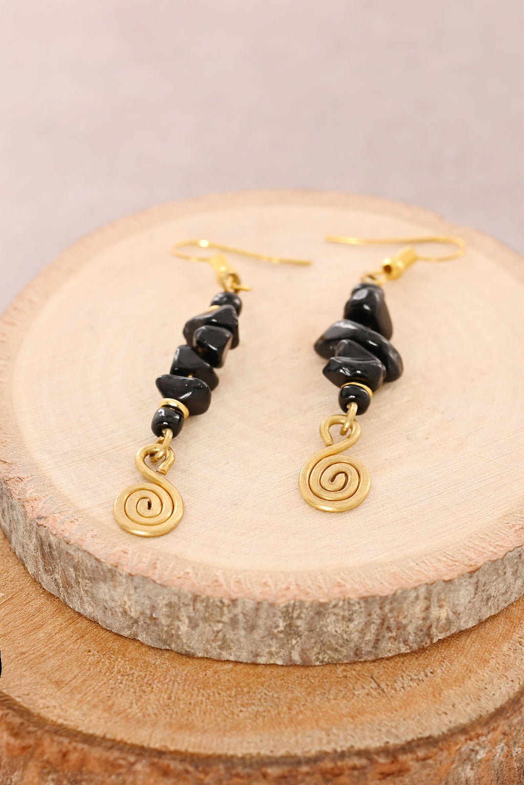 Midnight Stone & Brass Spiral Drop Earrings
