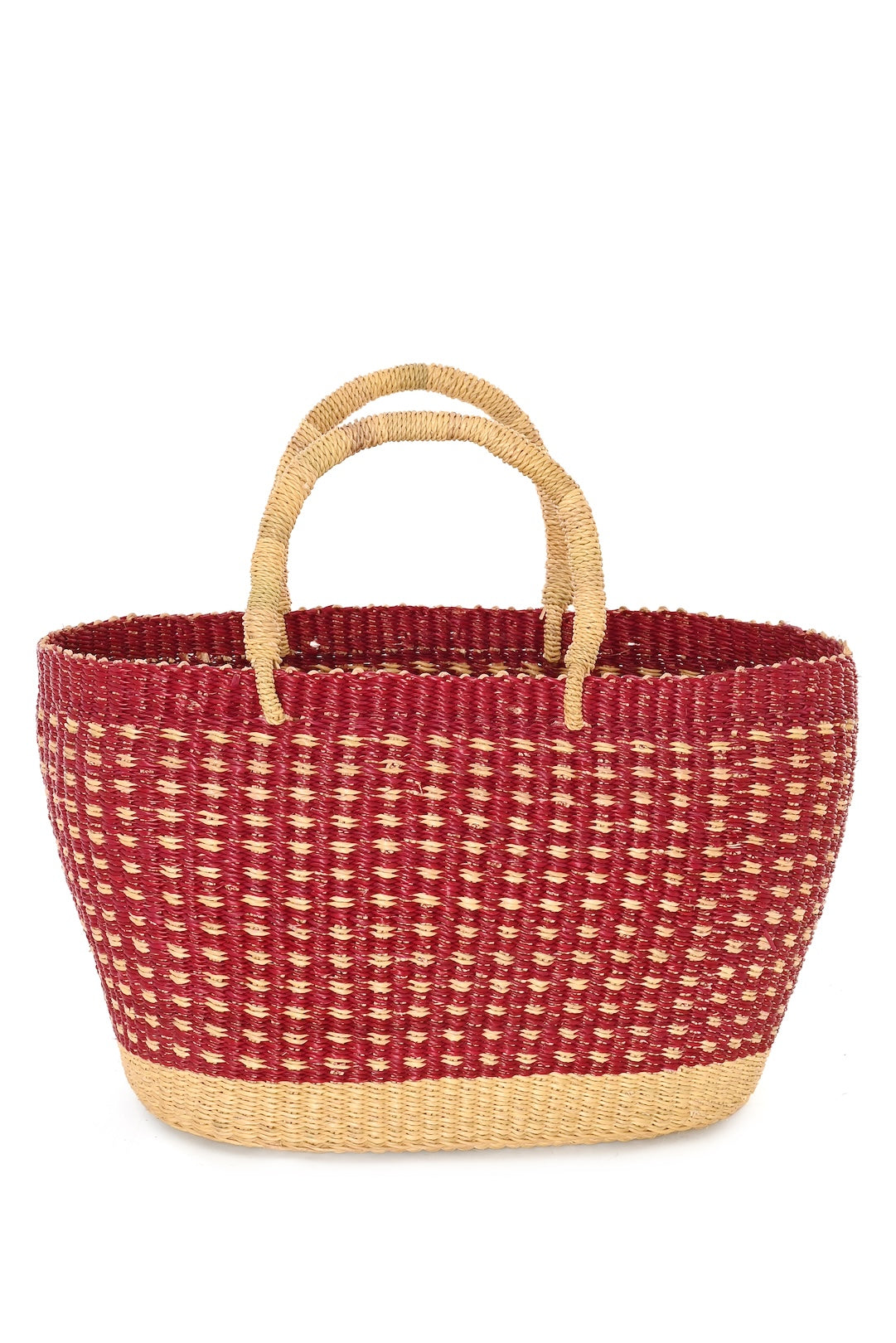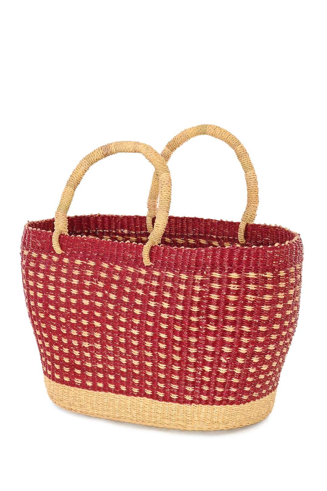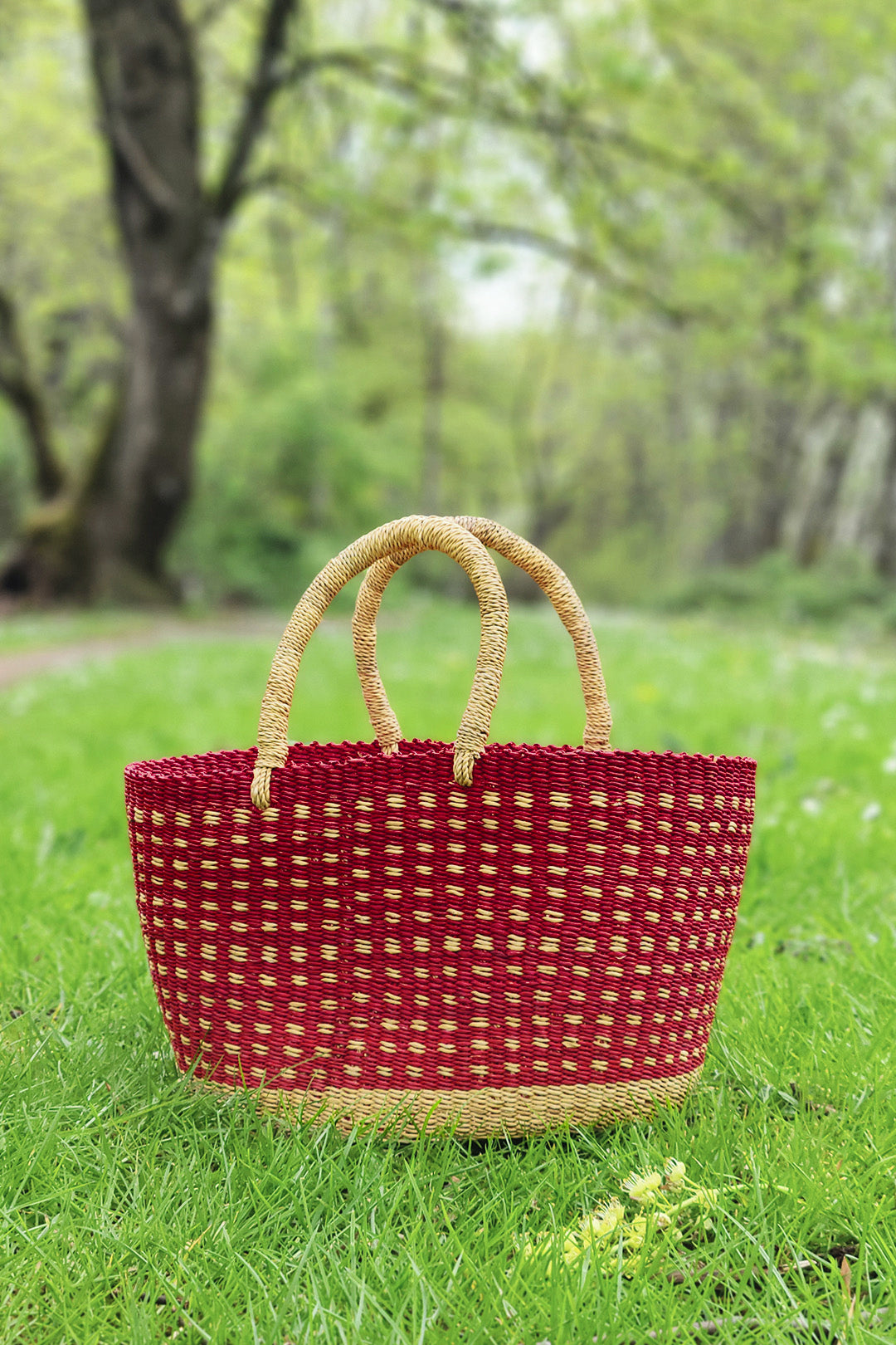 Artisans in the Bolgatanga region of Ghana weave this colorful checkered tote from thick, tough elephant grass that has been dyed a vibrant strawberry red. Bolga baskets can be easily wet down and reshaped, and can be used and enjoyed for years on end.