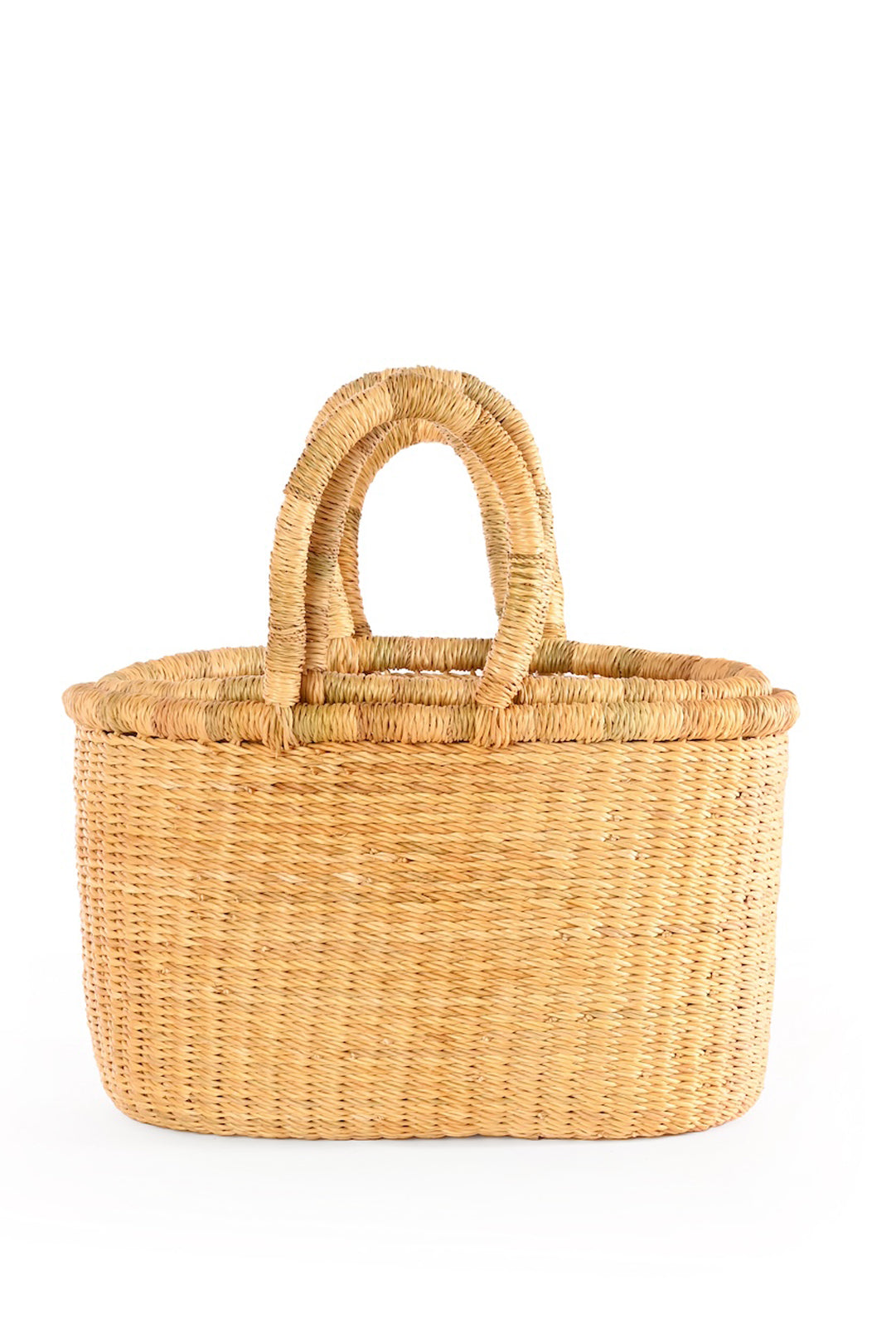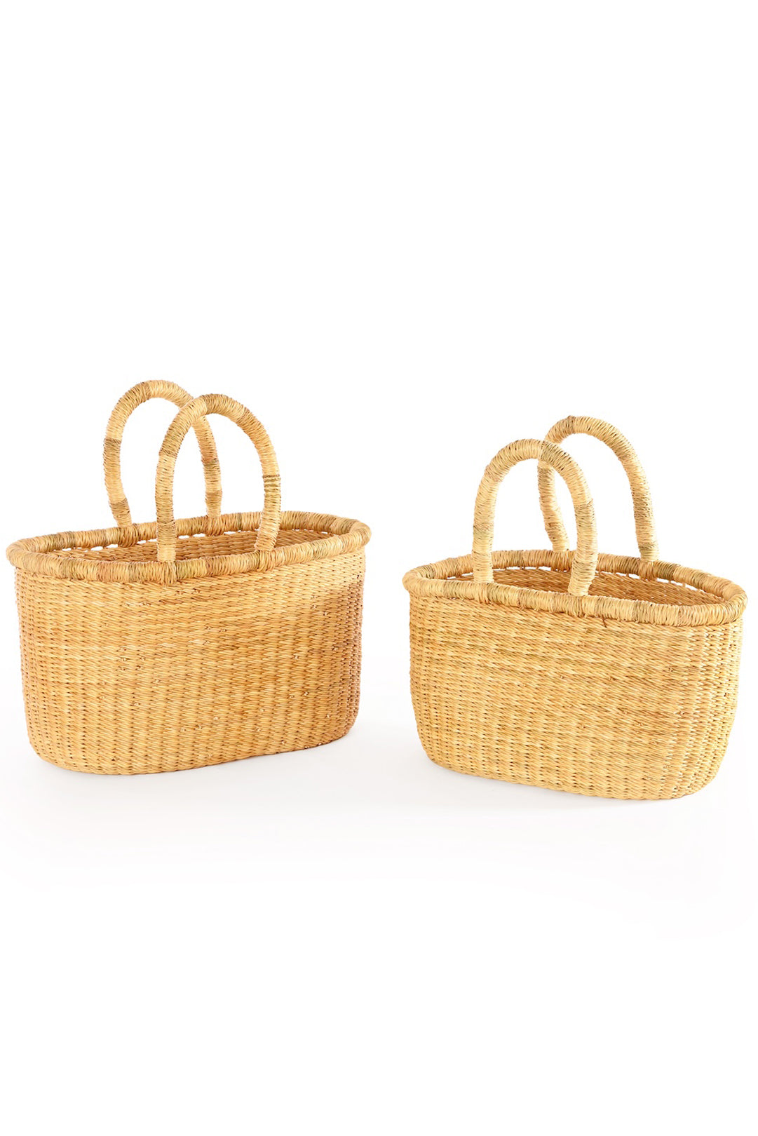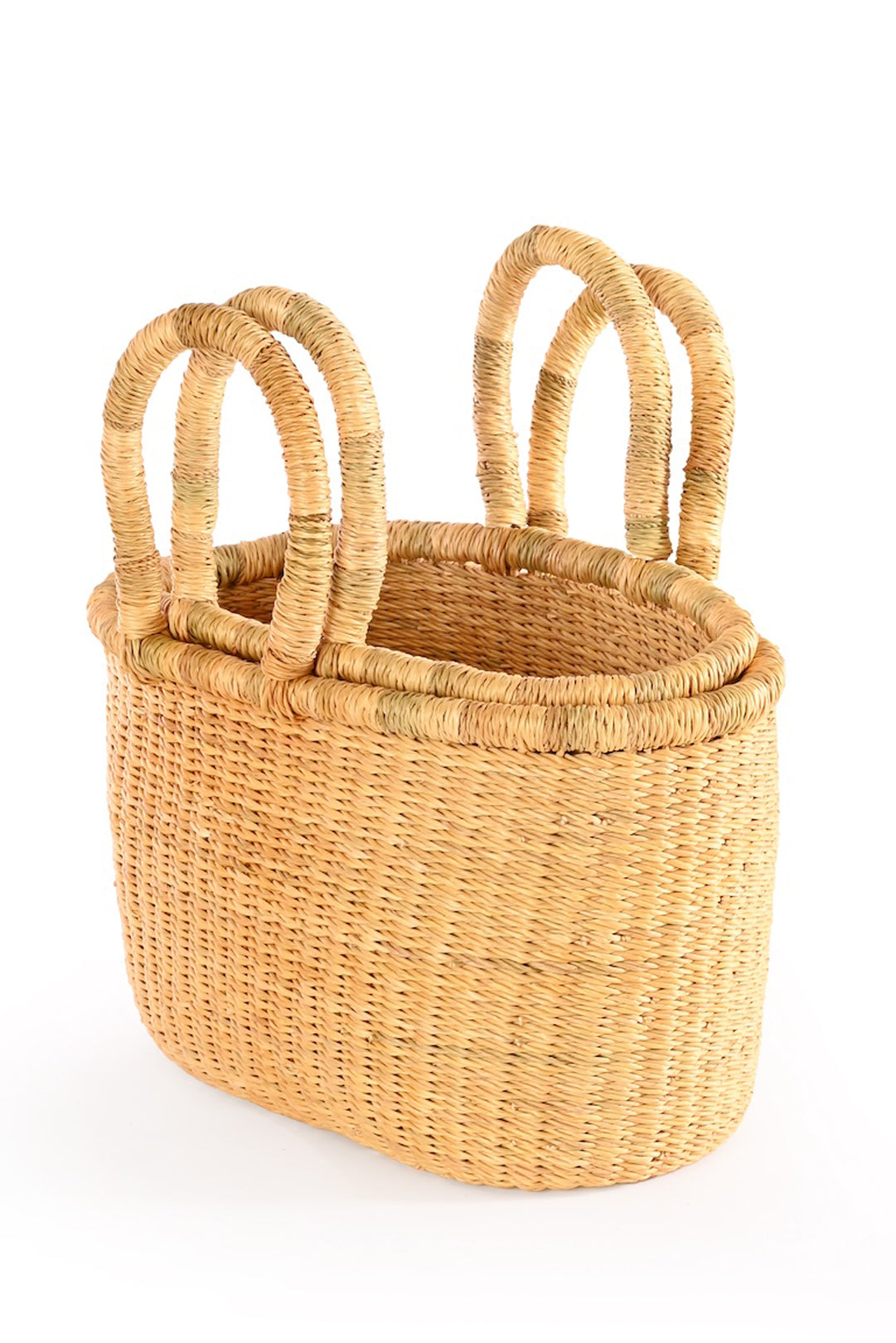 Artisans in the Bolgatanga region of Ghana weave together twisted strands of tough elephant grass to create this sweet pair of natural totes. The two baskets nest together for shipping and when not in use. Bolga baskets can be easily wet down and reshaped, and can be used and enjoyed for years on end.