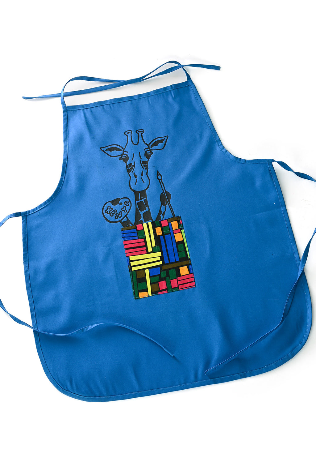 Blue Cotton Kids' Craft Apron with Giraffe and Colorful Pocket
