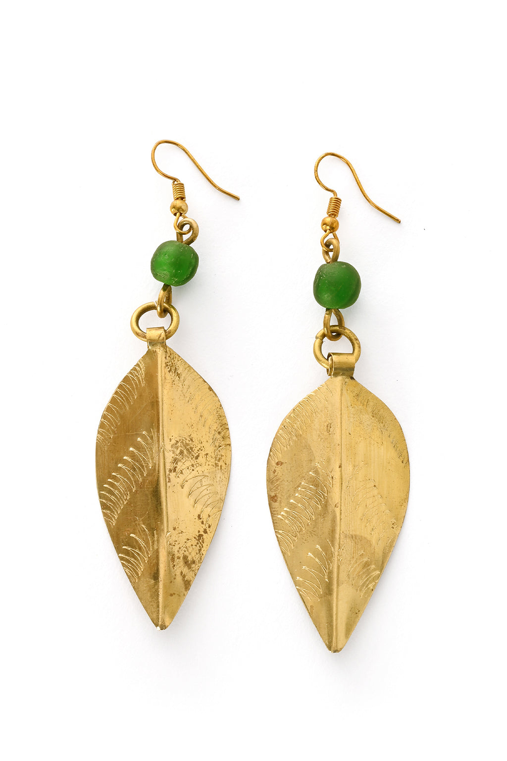 Etched Brass Leaf Earrings with Green Glass Bead