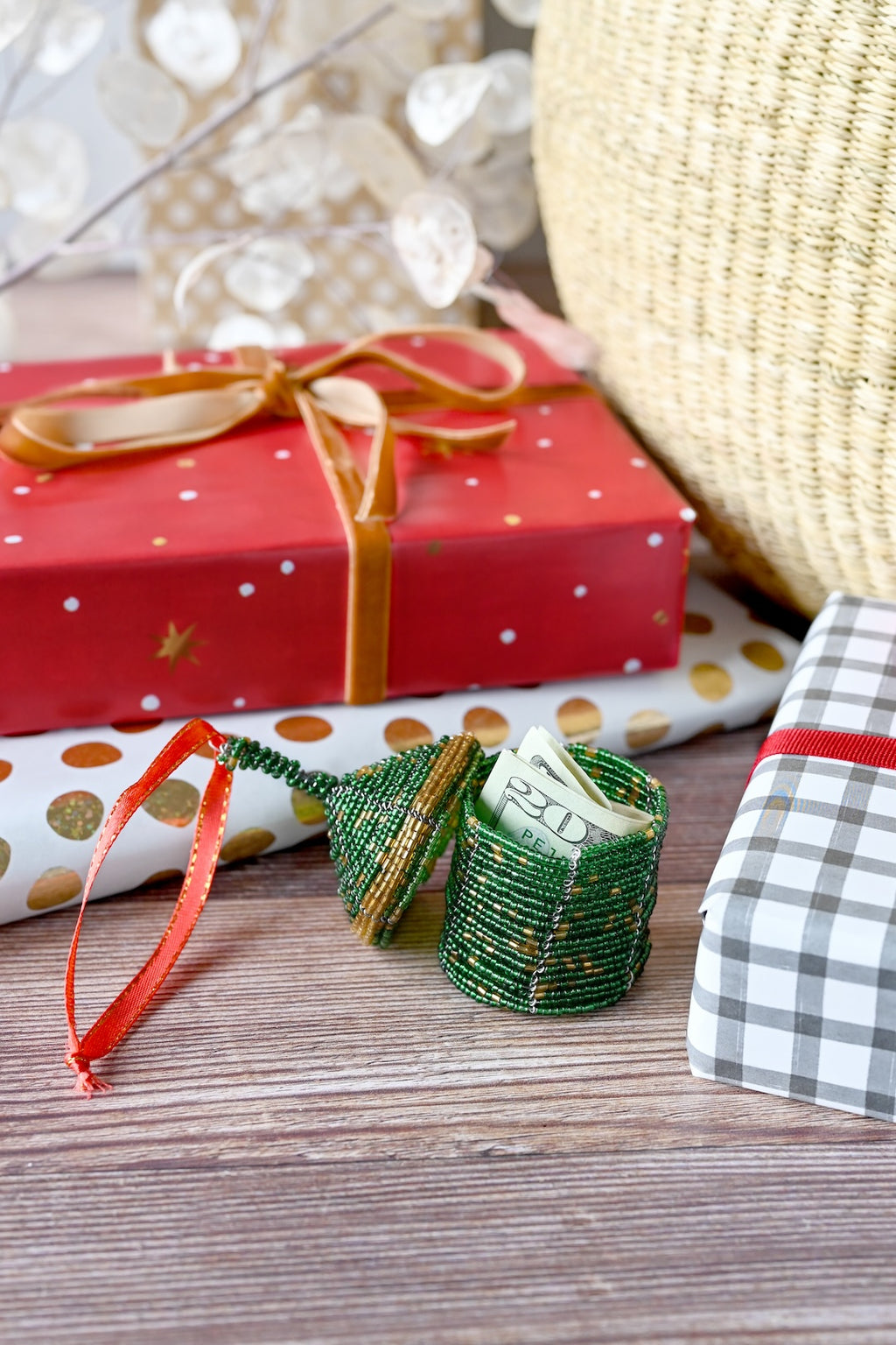 Green Beaded Holiday Gift Box Ornament