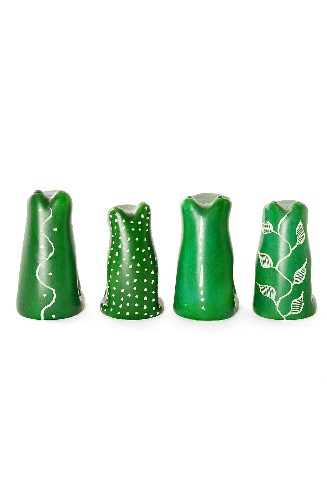 These silly little sculptures are hand carved by artisans in Kenya from soft soapstone, then dyed a vibrant green. To give each frog personality, artisans add googley eyes and etched geometric or floral designs.