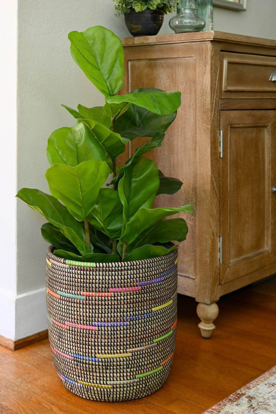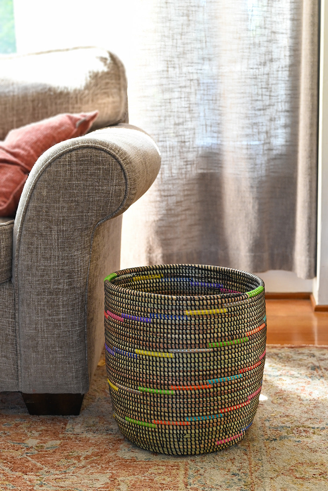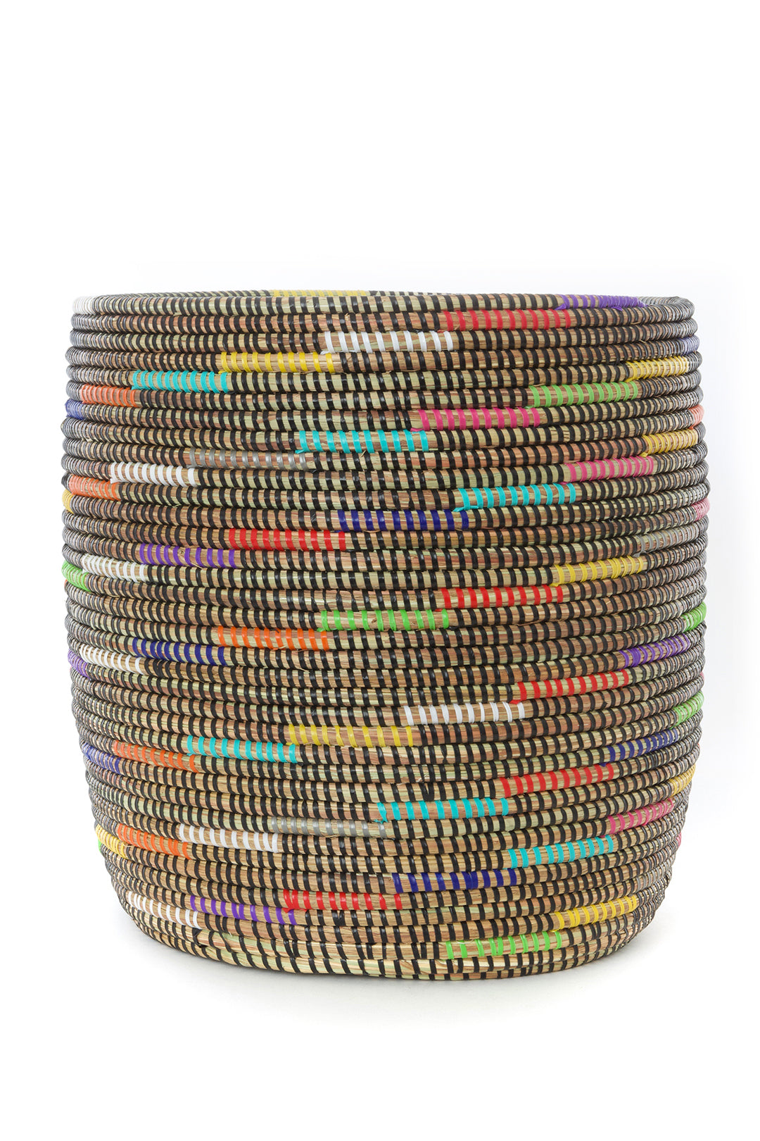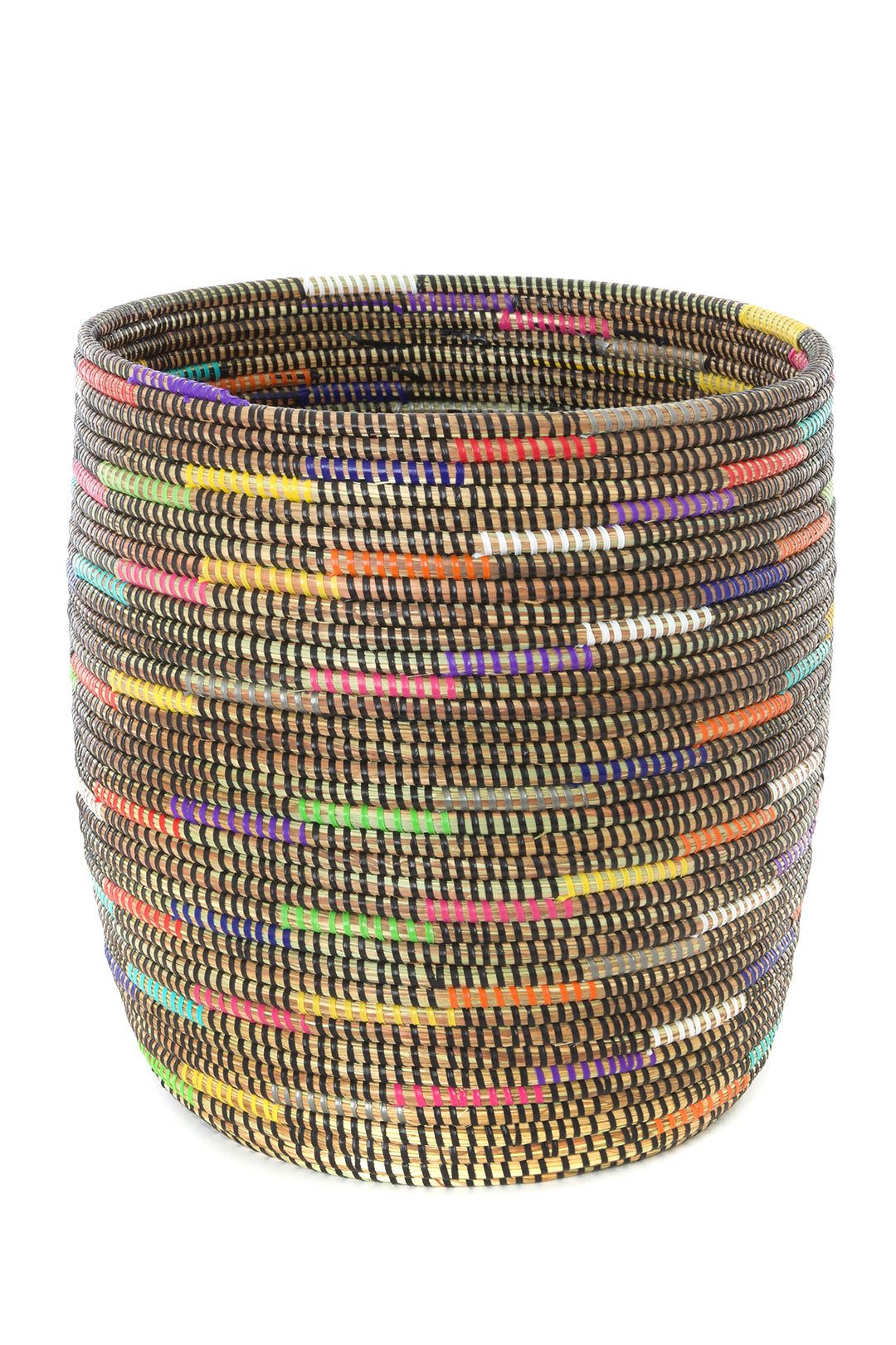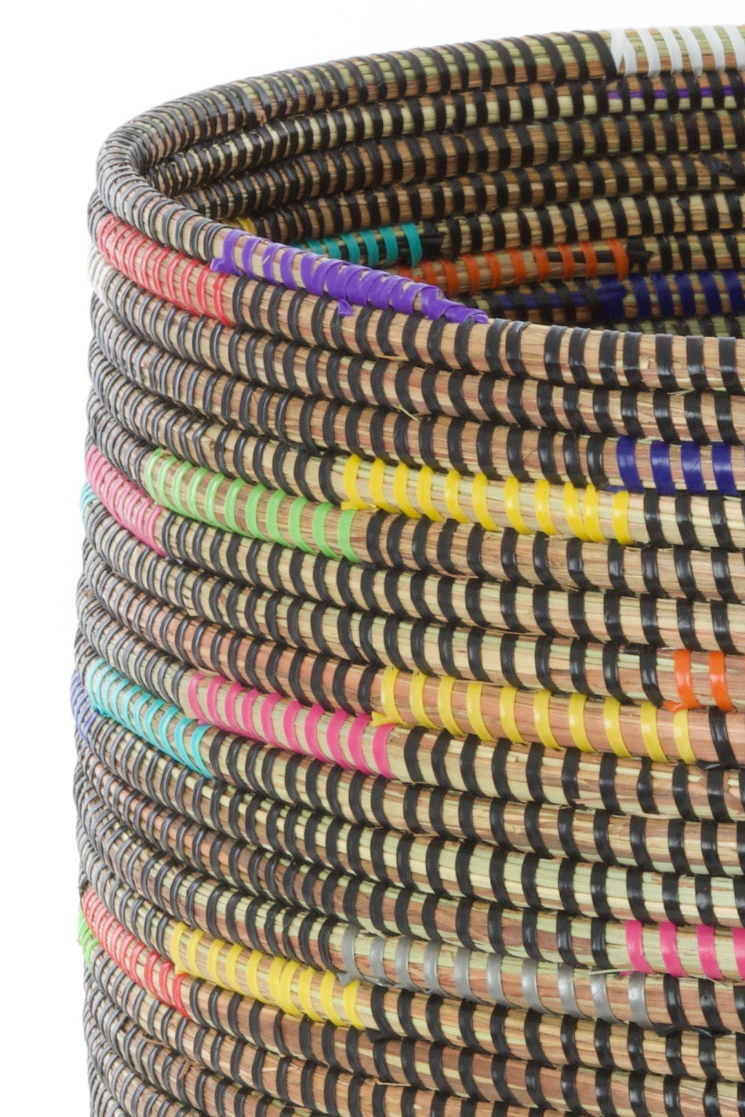 Wolof women in the West African nation of Senegal update traditional coil weaving methods by enlivening natural grass baskets with colorful strips of plastic salvaged from a mat factory. Cattails grow abundantly in rural Senegal, so women can earn a sustainable income from basket weaving while enriching homes around the world with modern African craftsmanship.