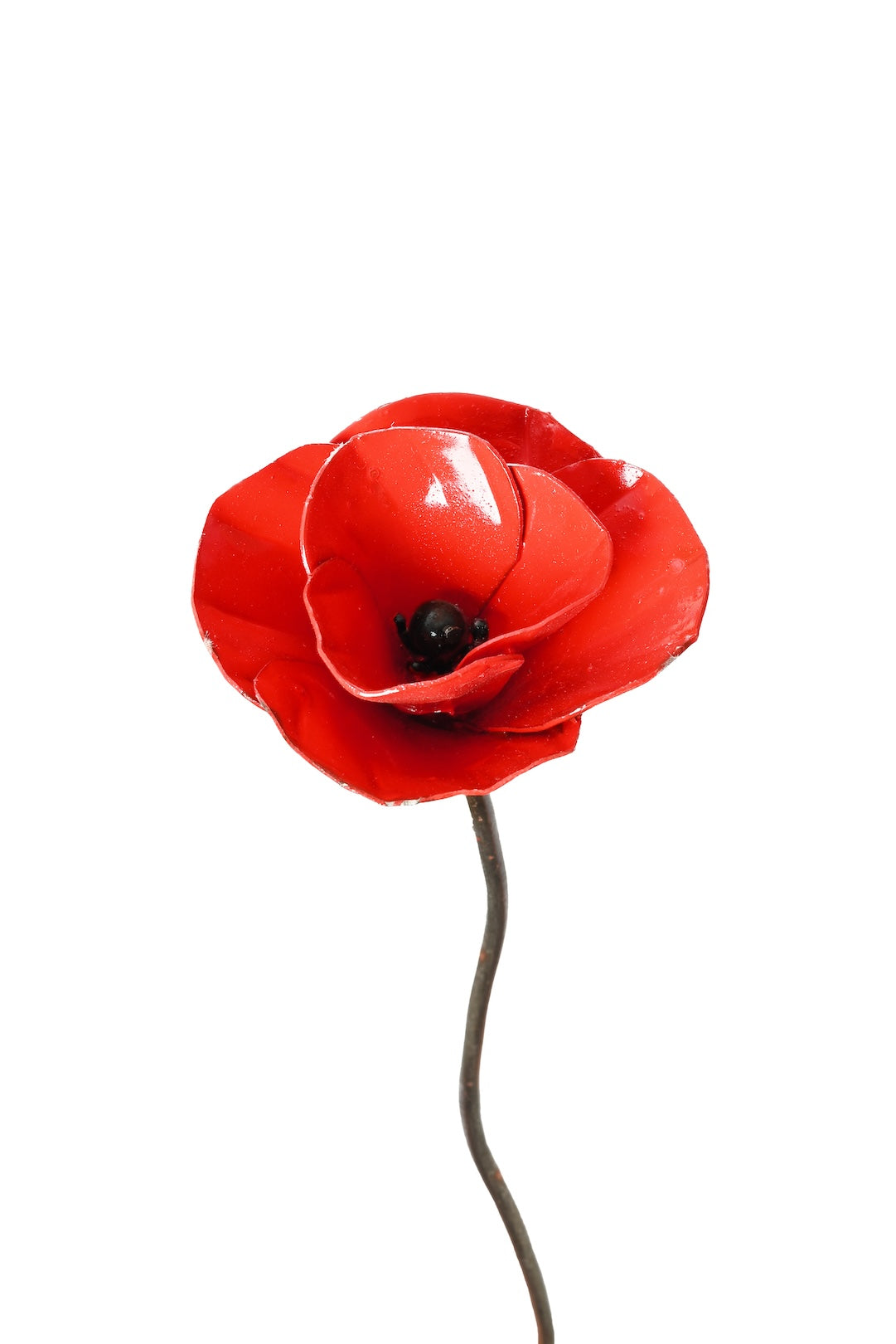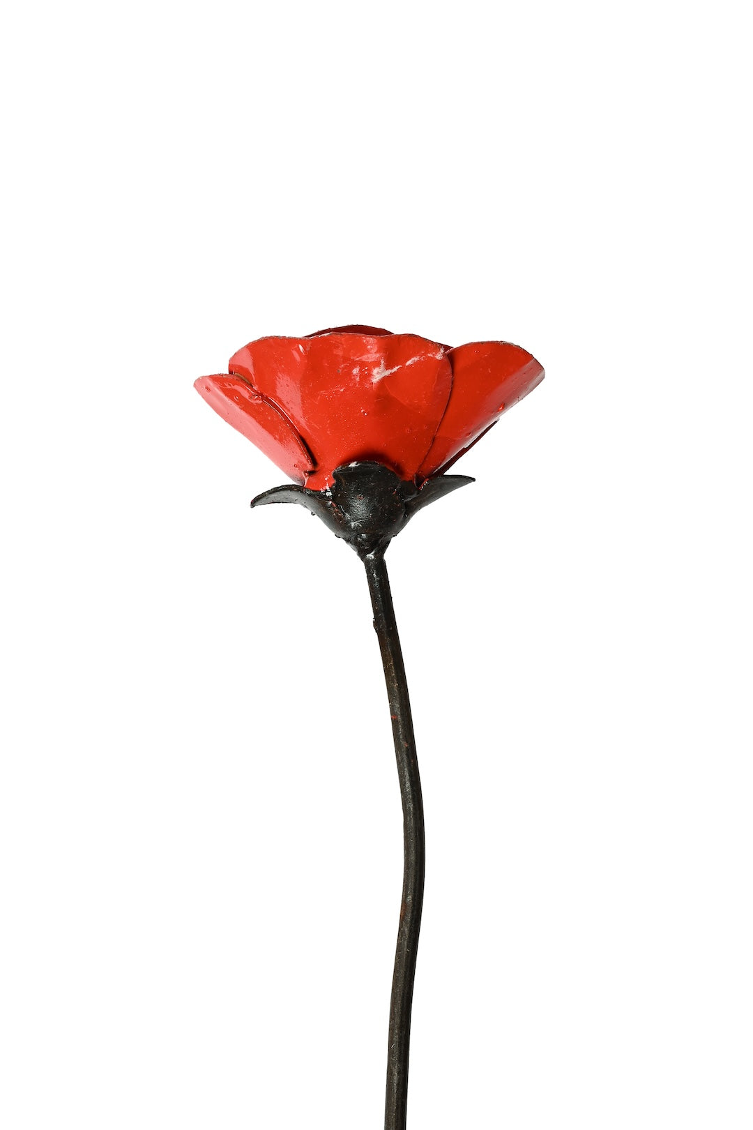 Zimbabwean sculptors create a unique textural element for the garden in this vibrant red poppy garden stake. Crafted from discarded metal and paint, each can be easily pressed into the garden among bushes or blooms.