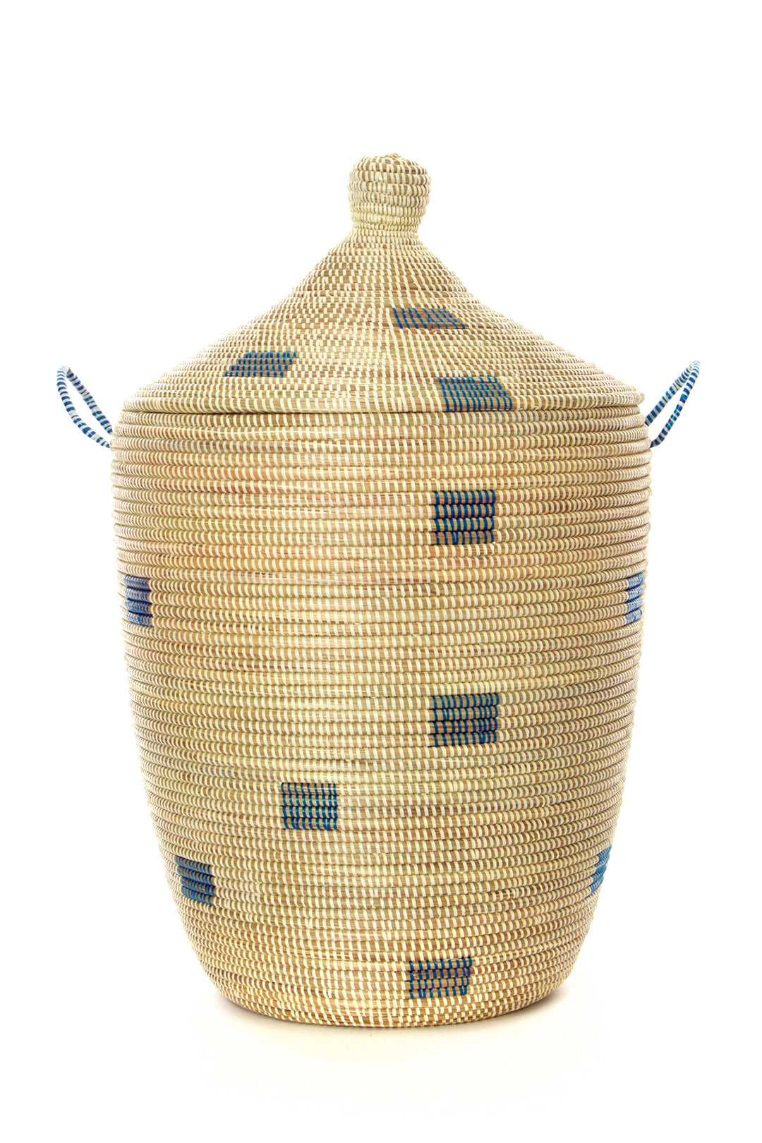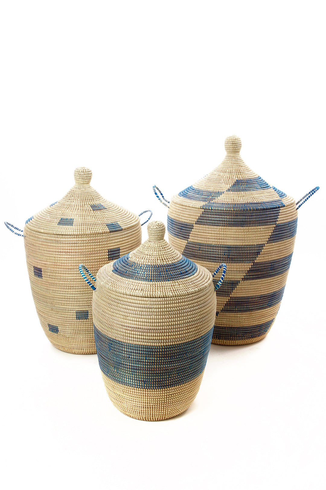 This gorgeous set of handcrafted baskets features three nesting sizes in three distinctive yet complementary patterns in blue and cream tones. Each basket is carefully handmade by a talented Wolof woman in rural Senegal.