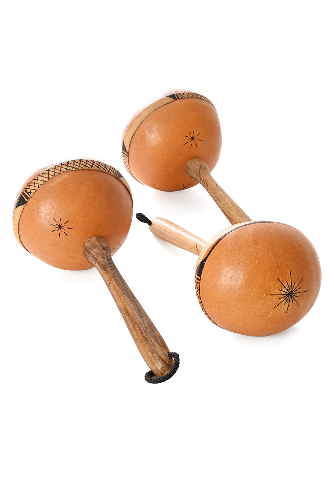 Ghanaian artisans transform a simple dried calabash into a fun, all-natural shaker with a wooden handle. Beads and limestone chippings are added to the interior of the squash to create a rattle when shaken. Each shaker includes decorative wood burning, with a combination of starbursts and geometric designs.