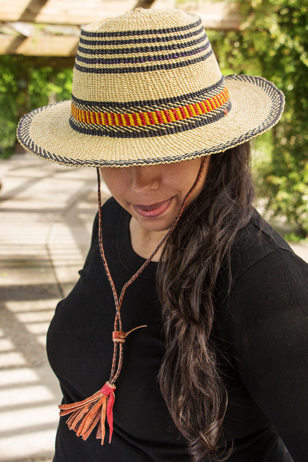 Ghanaian artisans weave stiff elephant grass into a fun sun hat with a classic shape and braided leather string. This versatile accessory offers sun protection for people of all ages, and can be quickly reshaped with just a little wet-down.
