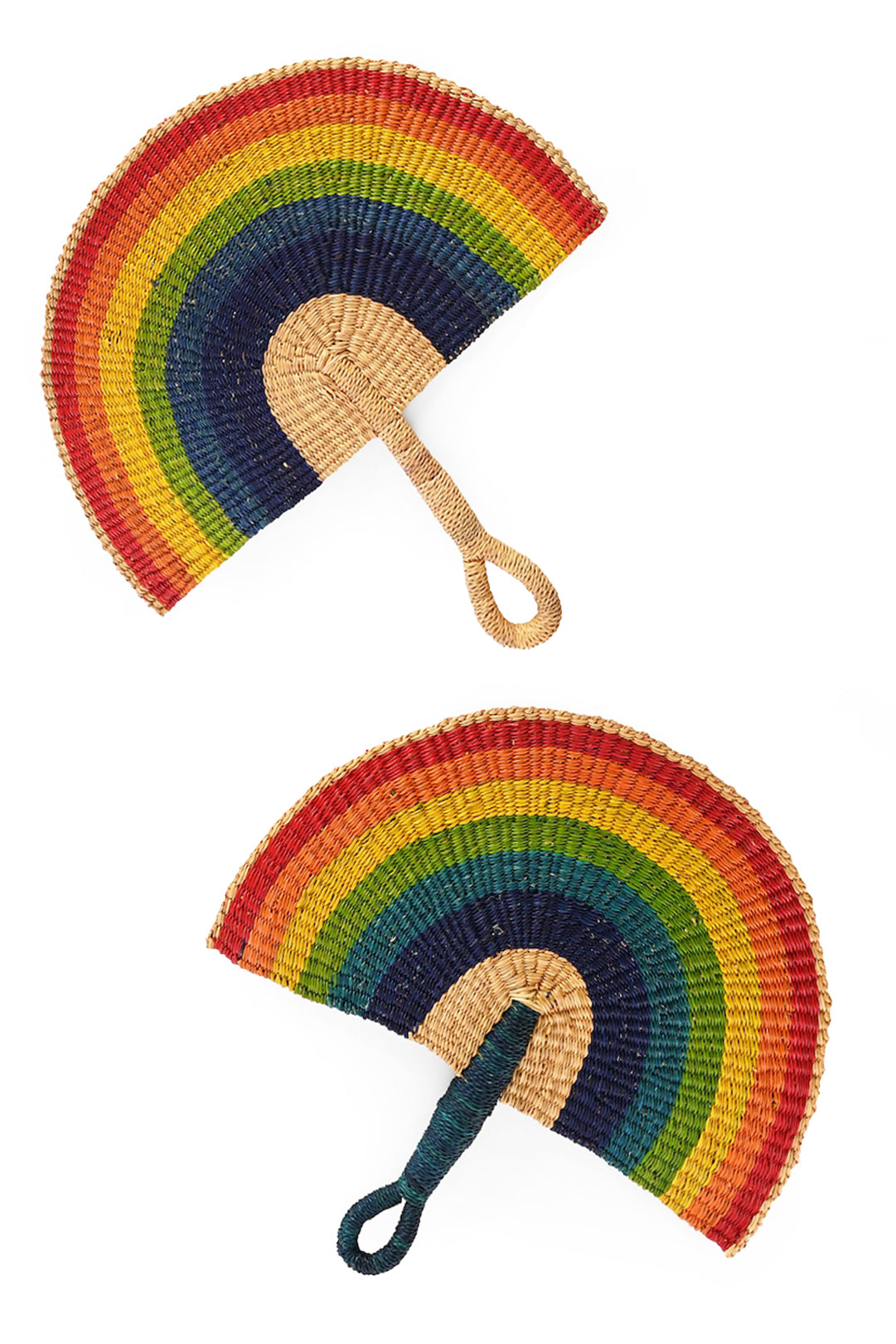 Talented weavers in Ghana's northern Bolgatanga region craft beautiful half-moon shaped hand fans from natural and colorfully dyed elephant grass. The fan doubles as wall art when not in use.