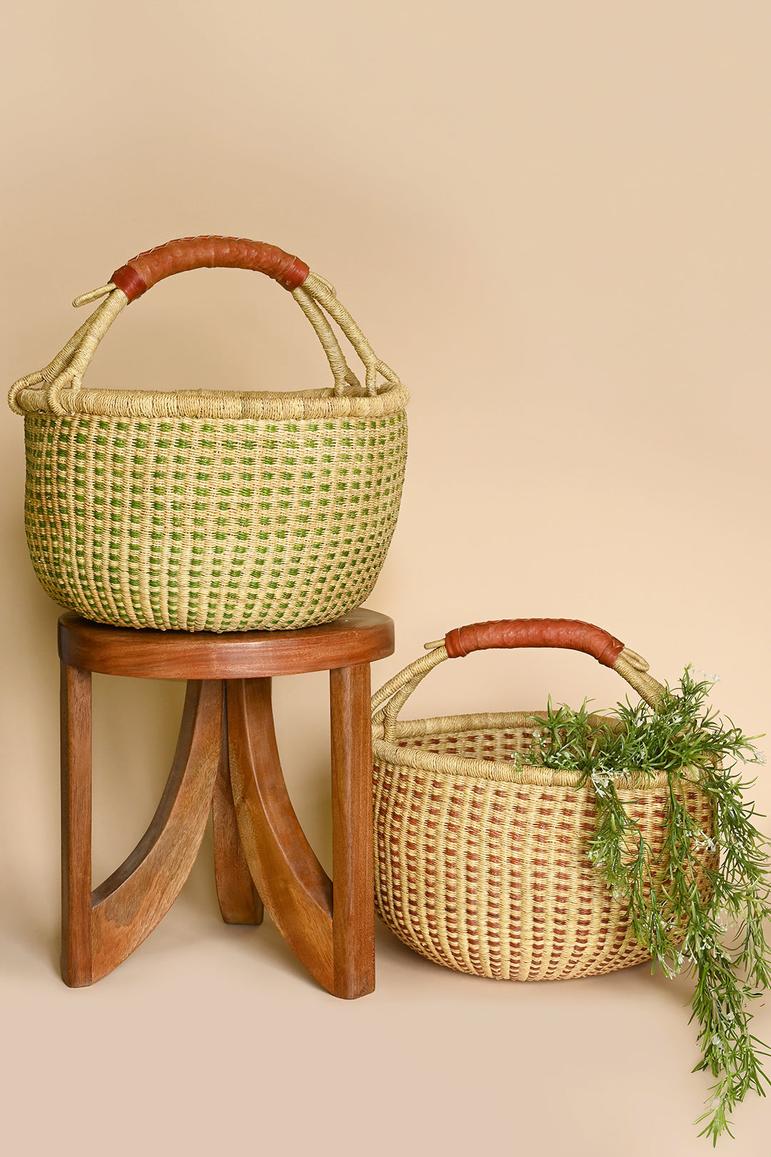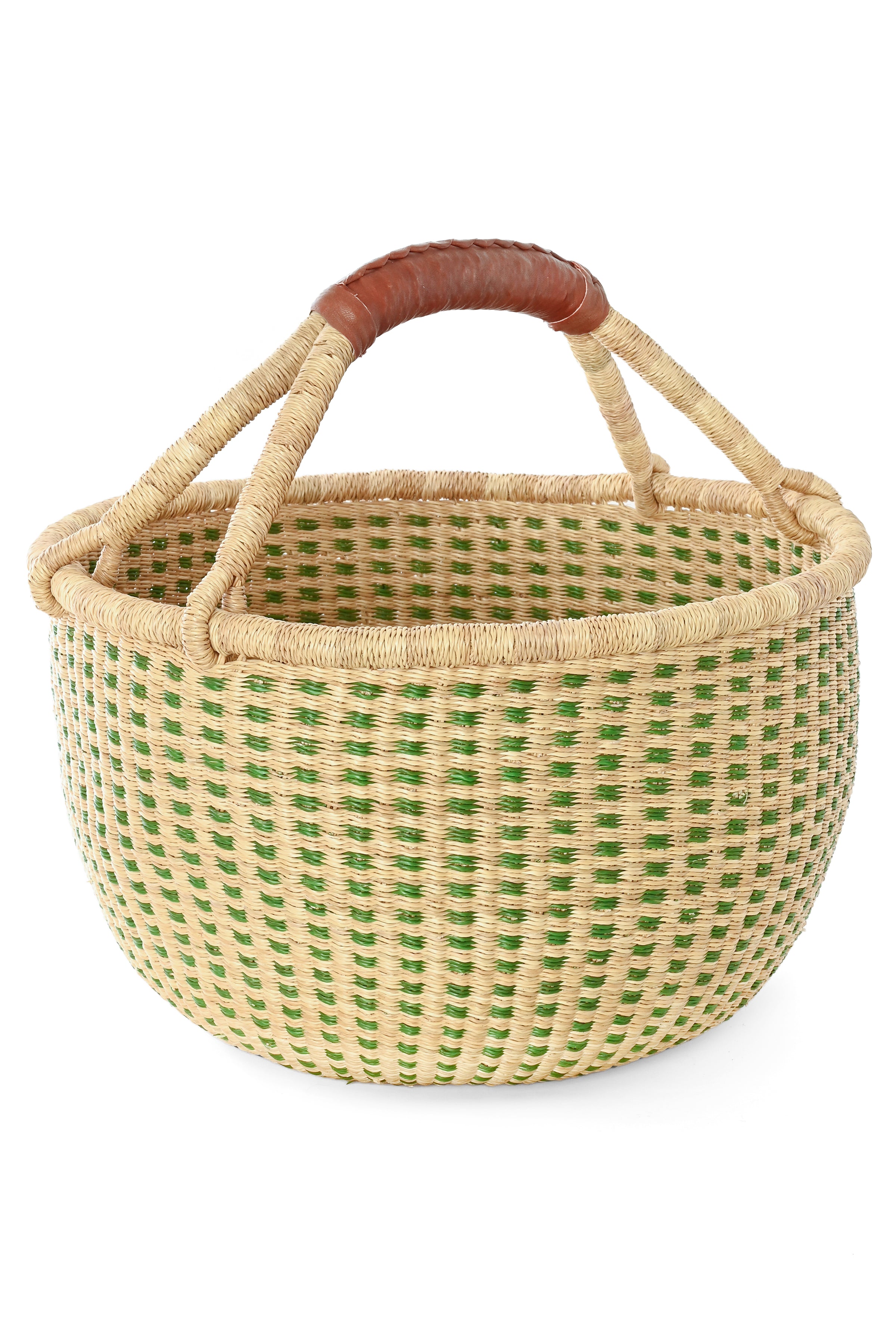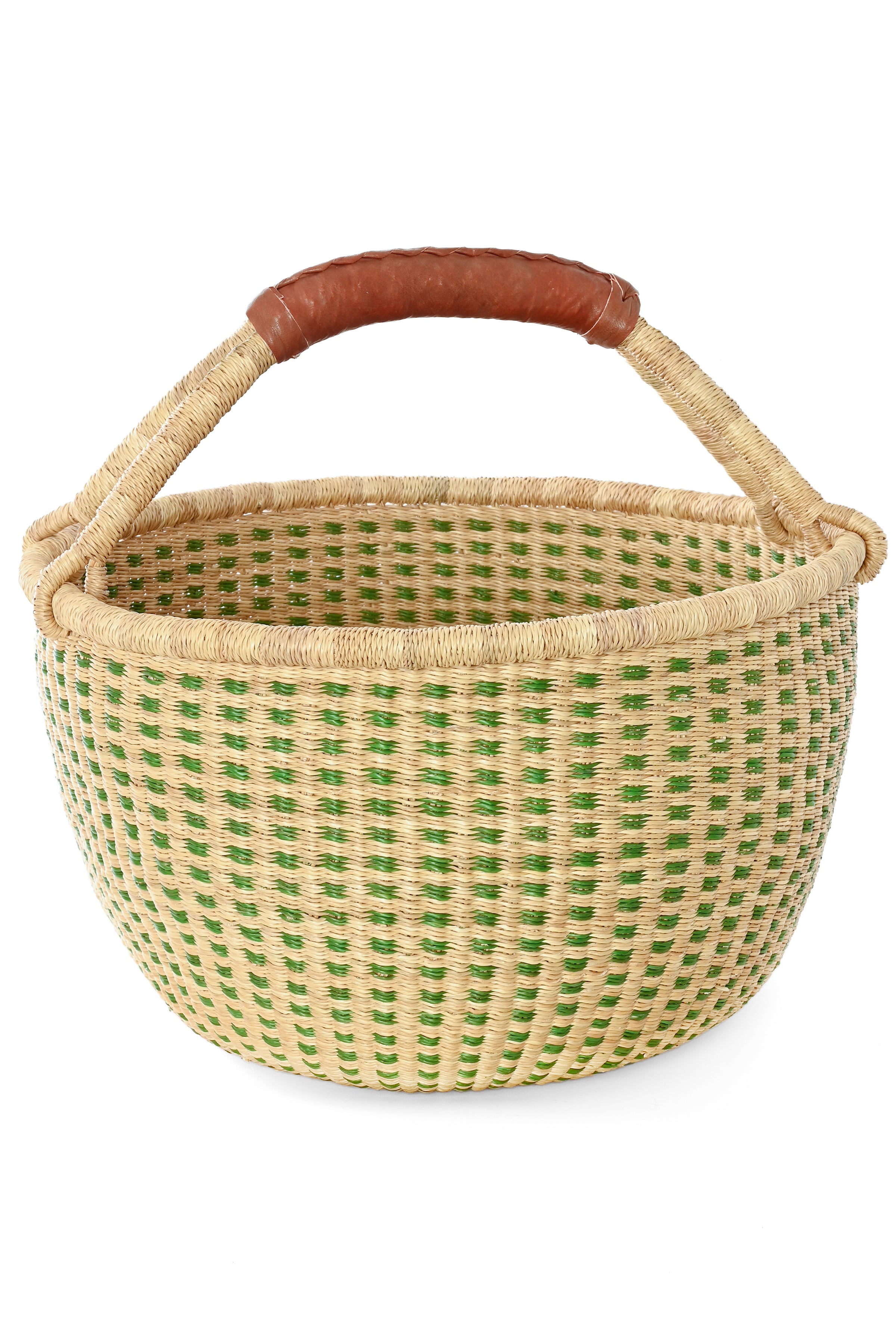 Handwoven by skilled artisans in Bolgatanga, Ghana, this Bolga basket is a beautiful, functional work of art crafted from stiff stalks of elephant grass. Known for their durability and iconic style, Bolga baskets are beloved in homes everywhere. This version features a natural and leafy green checked pattern with a soft brown leather-wrapped handle for added comfort and lasting use.