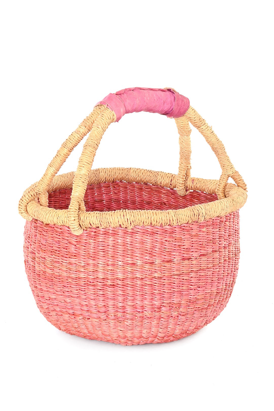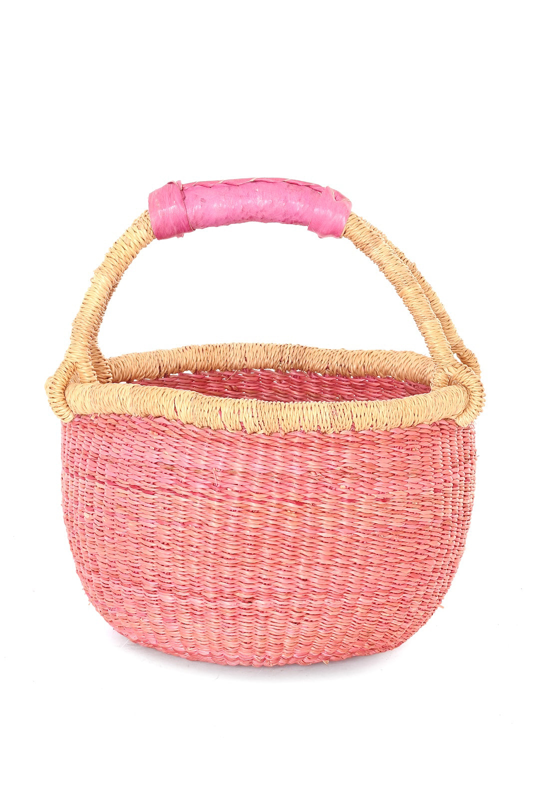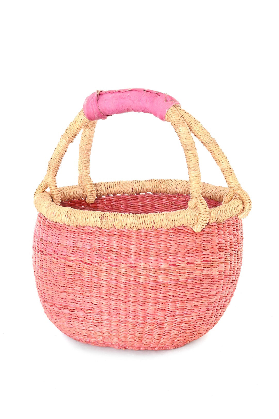 Artisans in the Bolgatanga region of Ghana hand-weave this smaller version of our classic Bolga basket using thick, durable elephant grass, finished with a coordinating leather handle. Known for their strength and longevity, Bolga baskets are a favorite among eco-conscious shoppers for errands, markets, and picnics. Designed to handle everyday use, they remain both functional and beautiful for years to come.