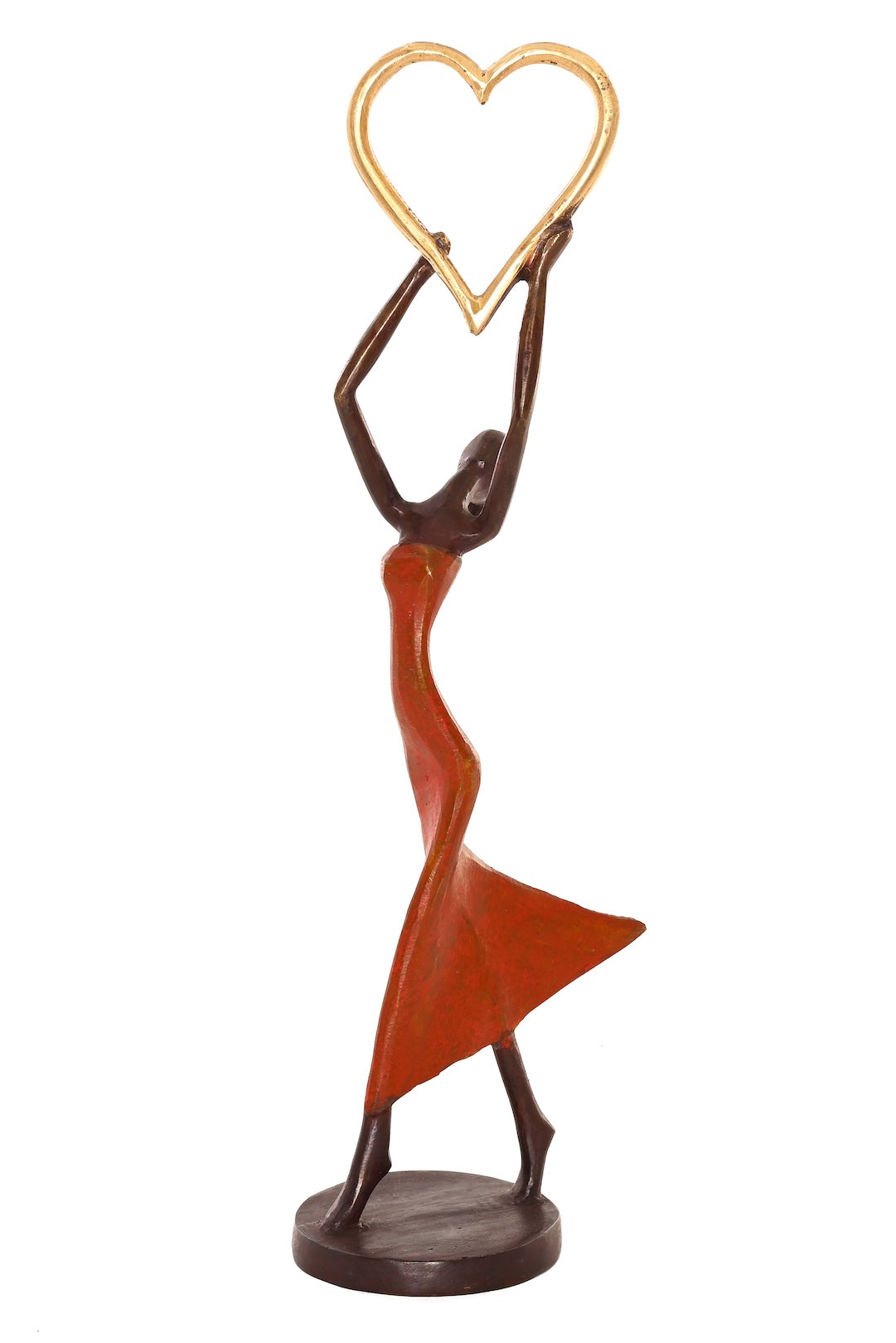 A small group of talented metal casting artisans in Burkina Faso craft this beautiful sculpture from recycled metal using a lost-wax casting process. Each sculpture bears unique characteristics that reveal the handmade nature of its creation. This piece portrays a woman in a strapless red dress, with her hair in a low bun. Her arms are raised holding a polished brass heart.