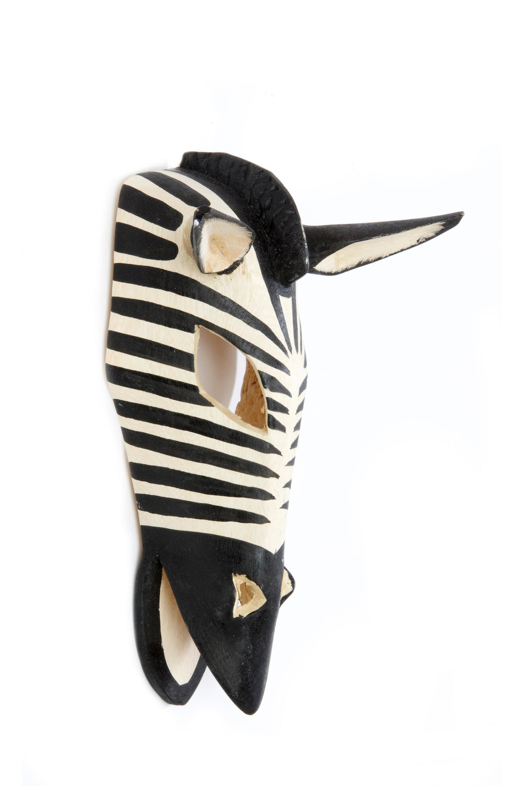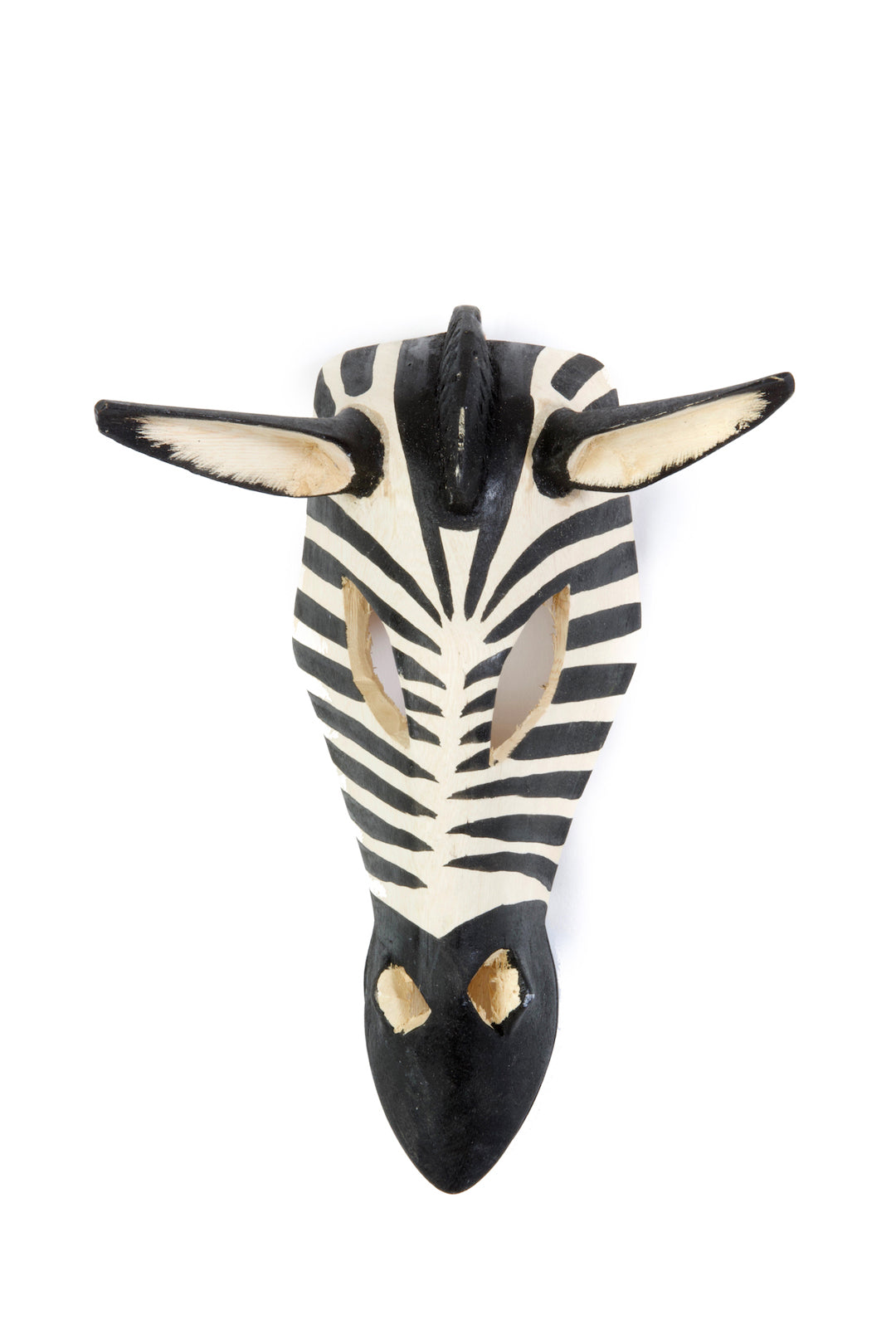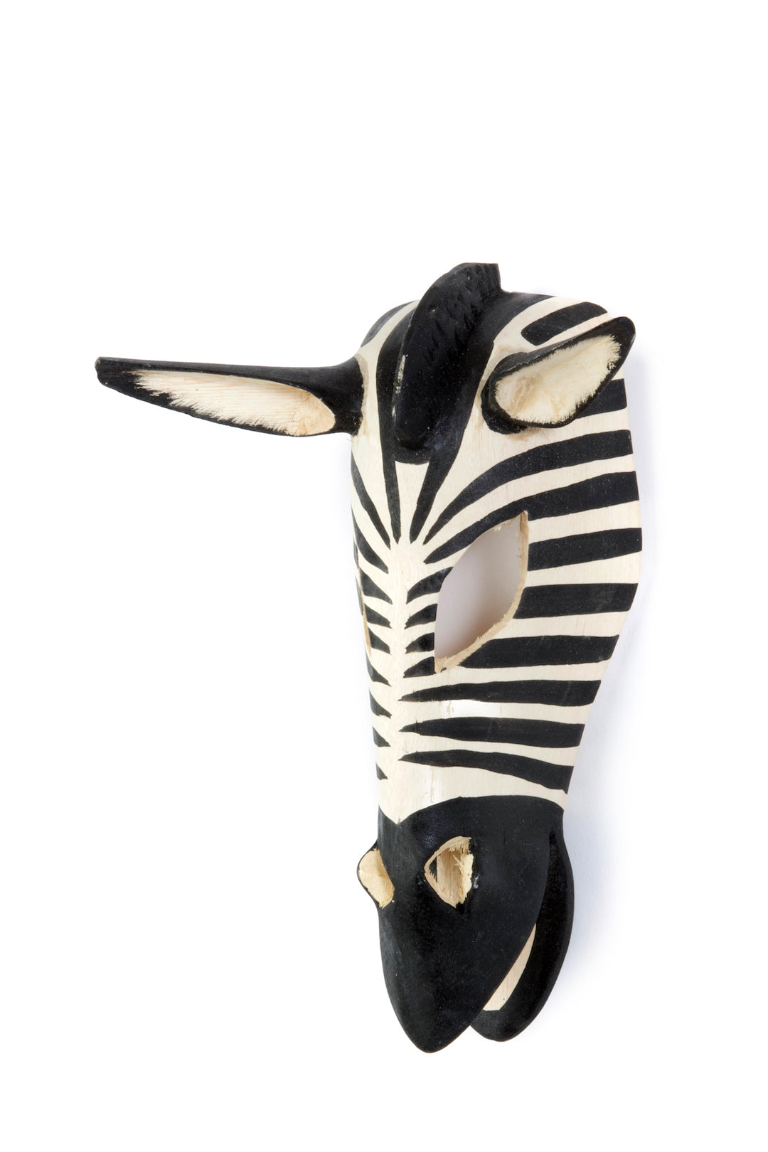 Talented Kenyan wood carvers hand carve jacaranda wood into a stylized zebra mask. Hand painted zebra stripes make this display mask a beautiful addition to the wall.