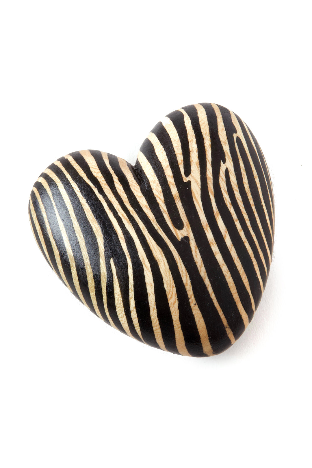 Kenyan wood carvers handcraft these unique keepsake hearts for safari enthusiasts and animal lovers. Each heart is hand carved from pale jacaranda wood and finished with a stained zebra print finish.