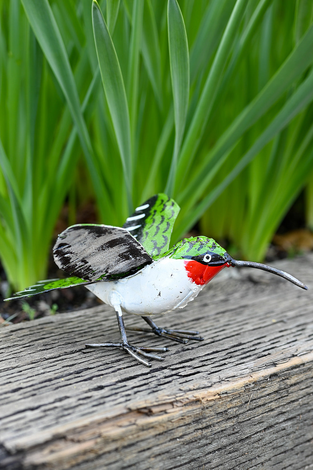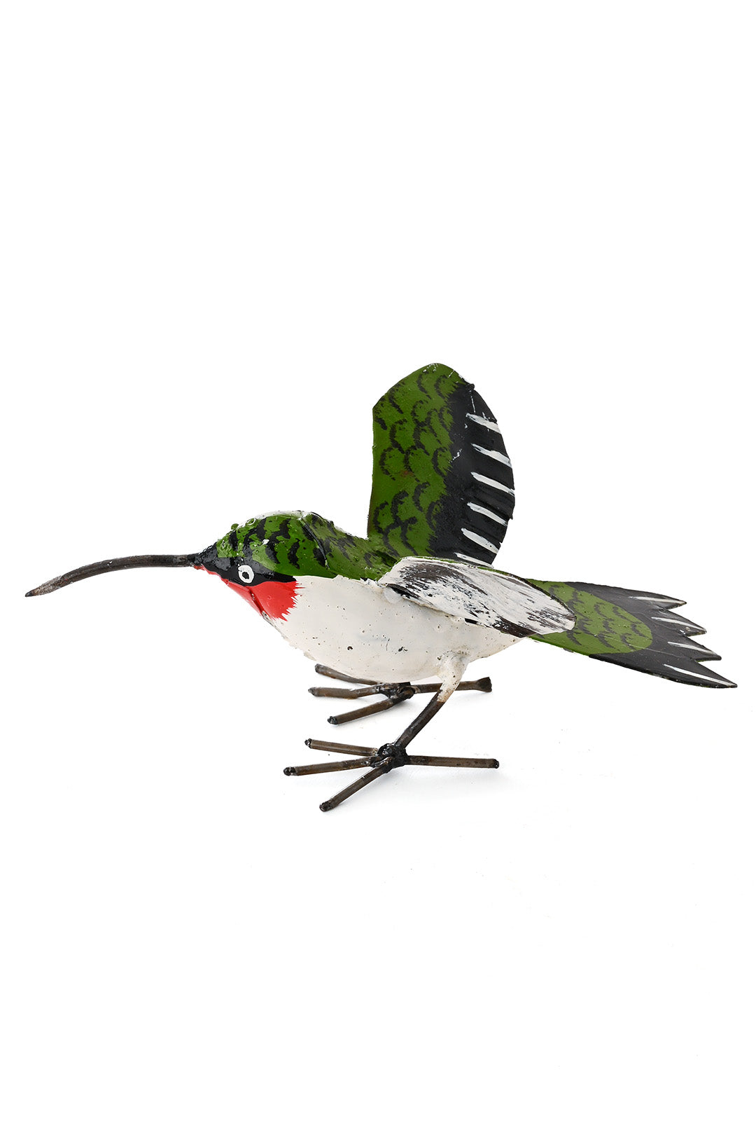 Zimbabwean artisans transform recycled scrap metal into these ruby-throated hummingbird sculptures, with wings spread. Each detail is hand painted.