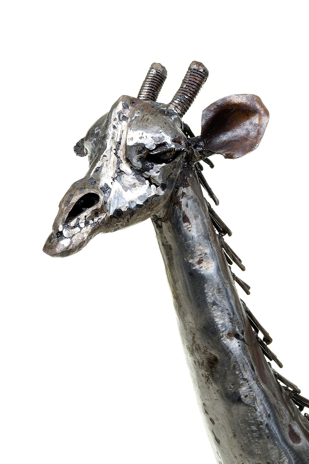 Driving out of Nairobi on Ngong Road, we find Kabiria Metal Works, where Moses and his crew of metal artists weld realistic and abstract statues from recycled oil drums and scrapped engine parts. A beautiful addition to the home or garden, each giraffe statue is handcrafted from the ground up and exhibits its own unique characteristics.