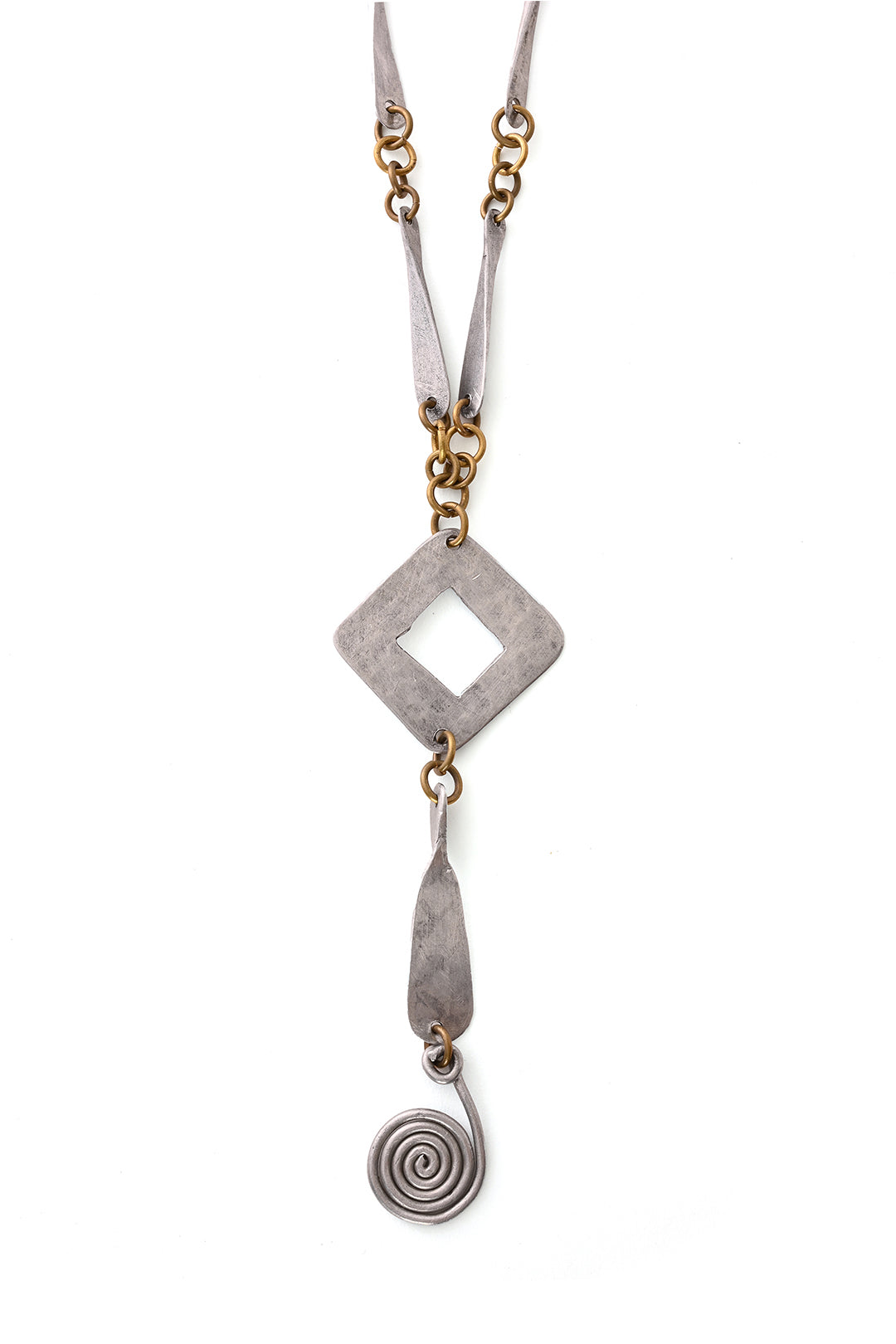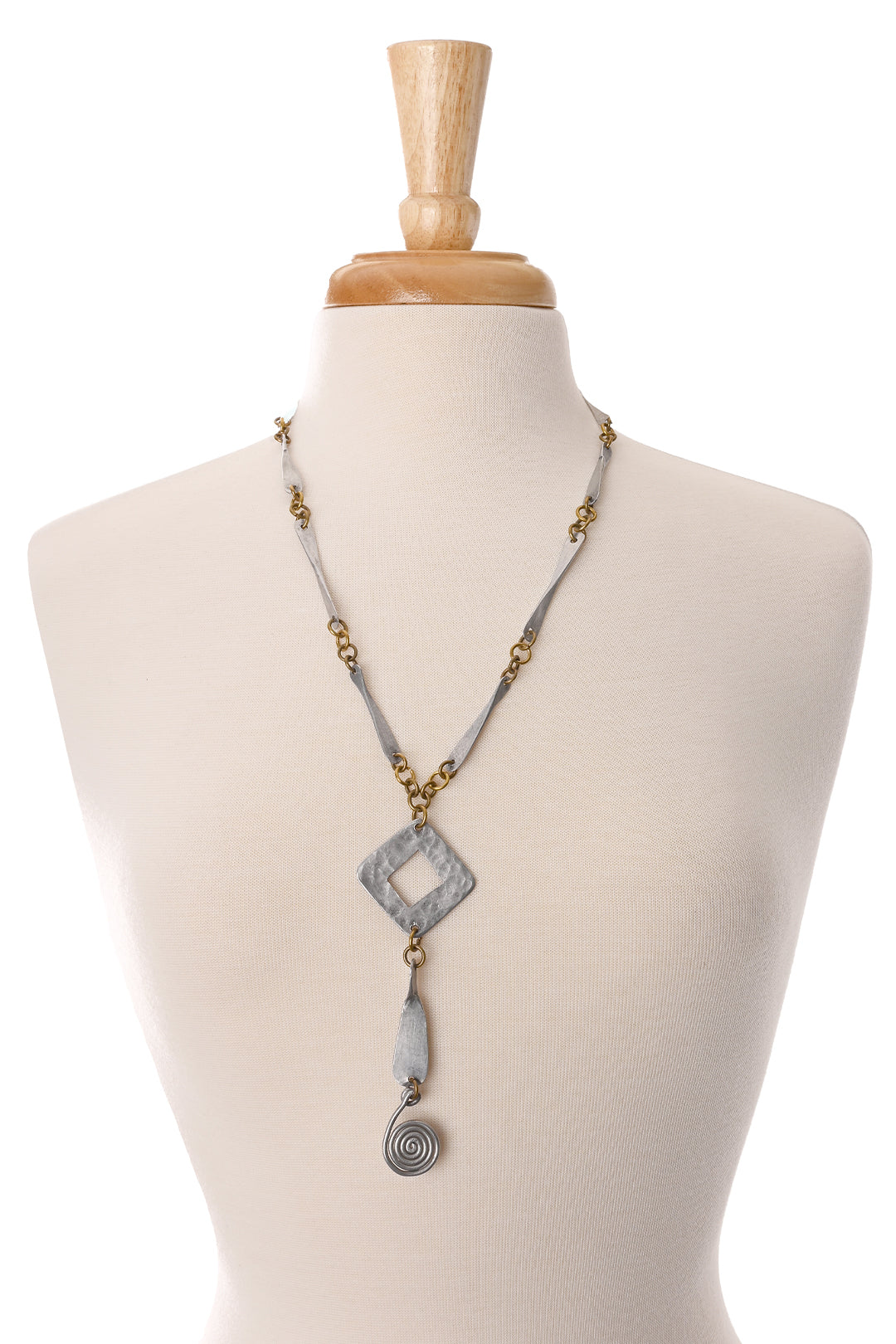 Artisans in Kenya hand-forge lightweight aluminum into textured links, fastened with contrasting brass rings and a sturdy brass clasp. A diamond-shaped aluminum pendant anchors the piece, with a traditional spiral charm suspended from an aluminum link at its base, finished with two oblong batiked bone beads at the clasp. Lightweight and easy to wear, this necklace offers a modern take on timeless forms.