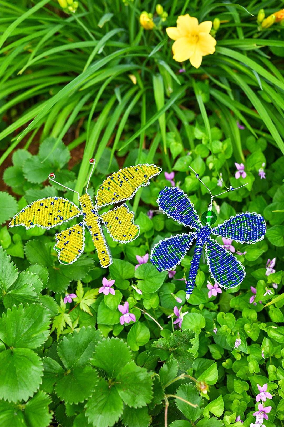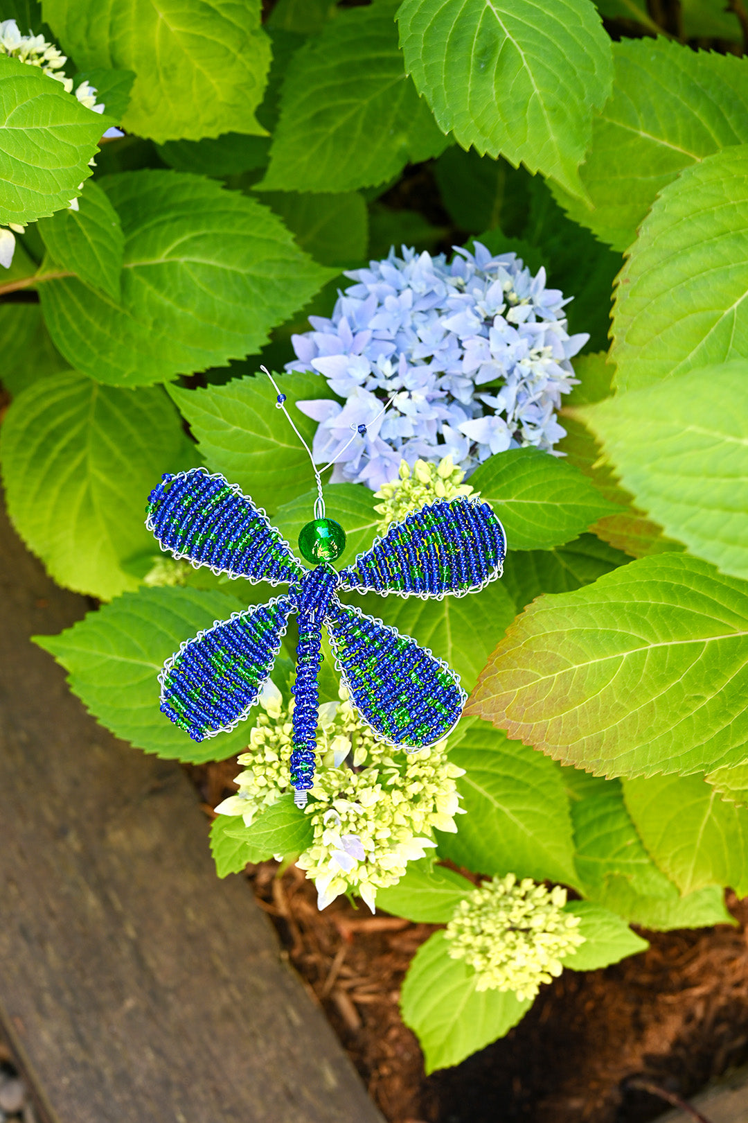 This sweet dragonfly garden stake is crafted from glass beads and recycled metal, and can be gently pressed down into a flower bed, or a large planter.