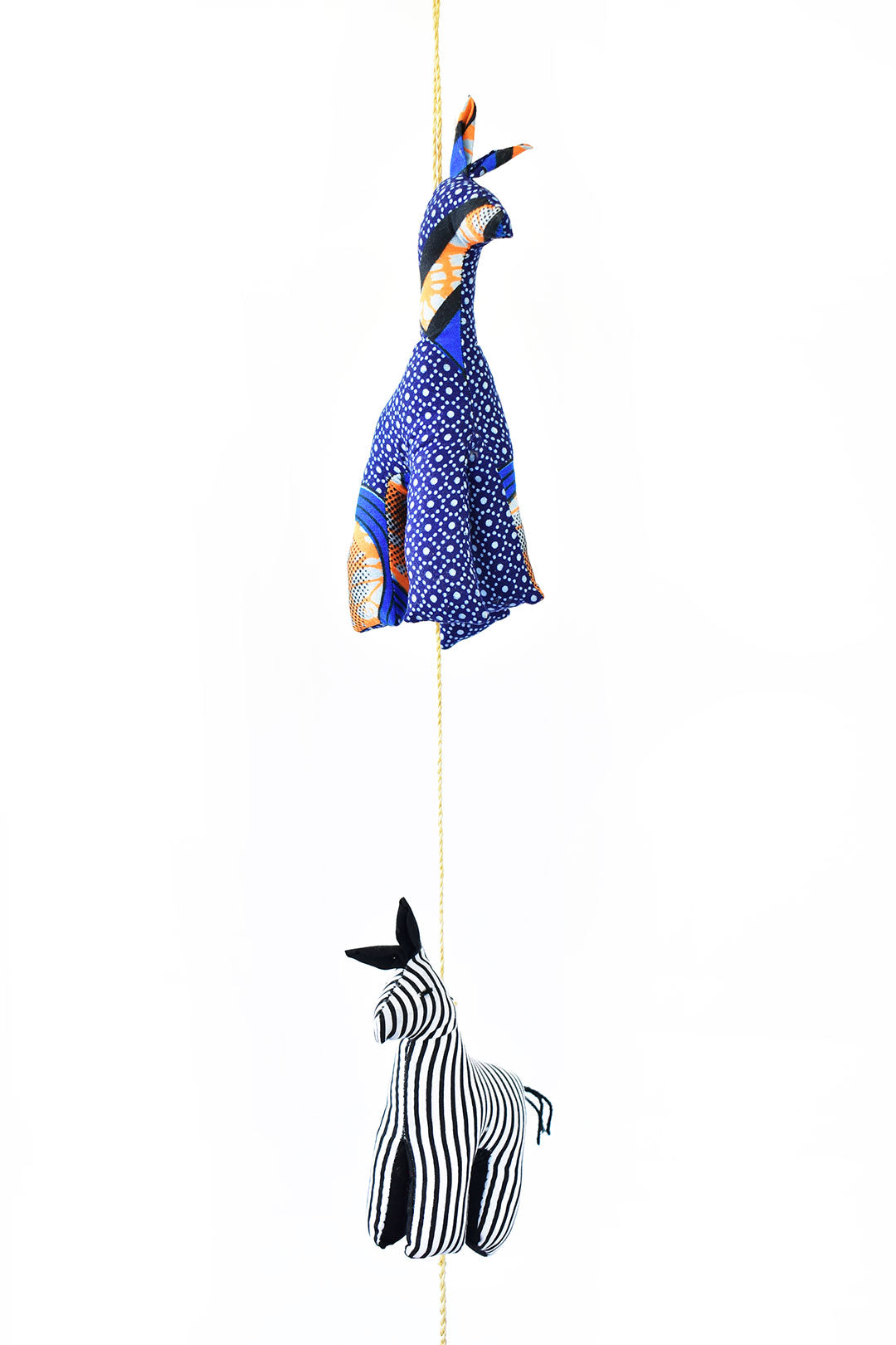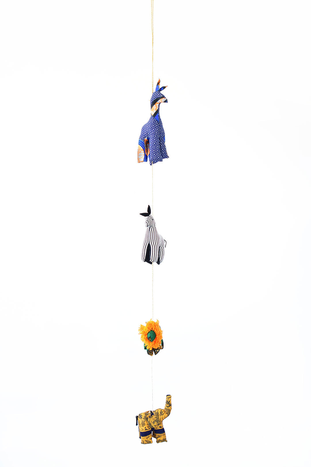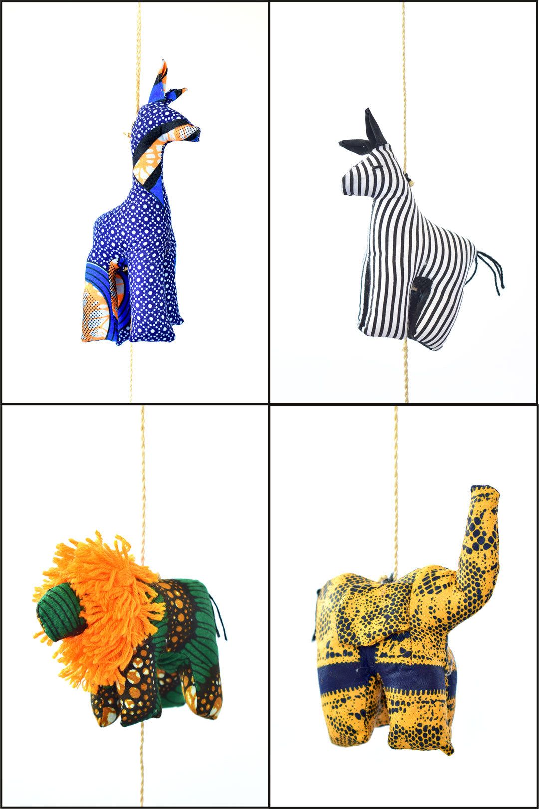 From her home in Kampala, Uganda, mother-of-three Betty and four other local women craft these fun hanging wall art pieces from scraps of striped cotton cloth. Each animal is stuffed with poly fiber, then suspended together with natural fiber cord.