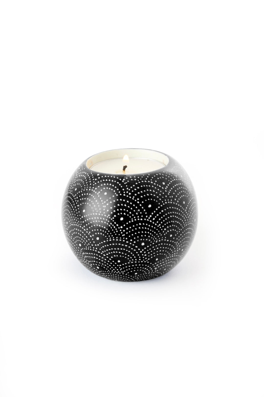 Carvers in Kenya's western highlands craft the basic form for a sphere tea light candle holder from soft soapstone. Artisans in a Nairobi workshop then add a rich black dyed finish and art deco inspired etched details.