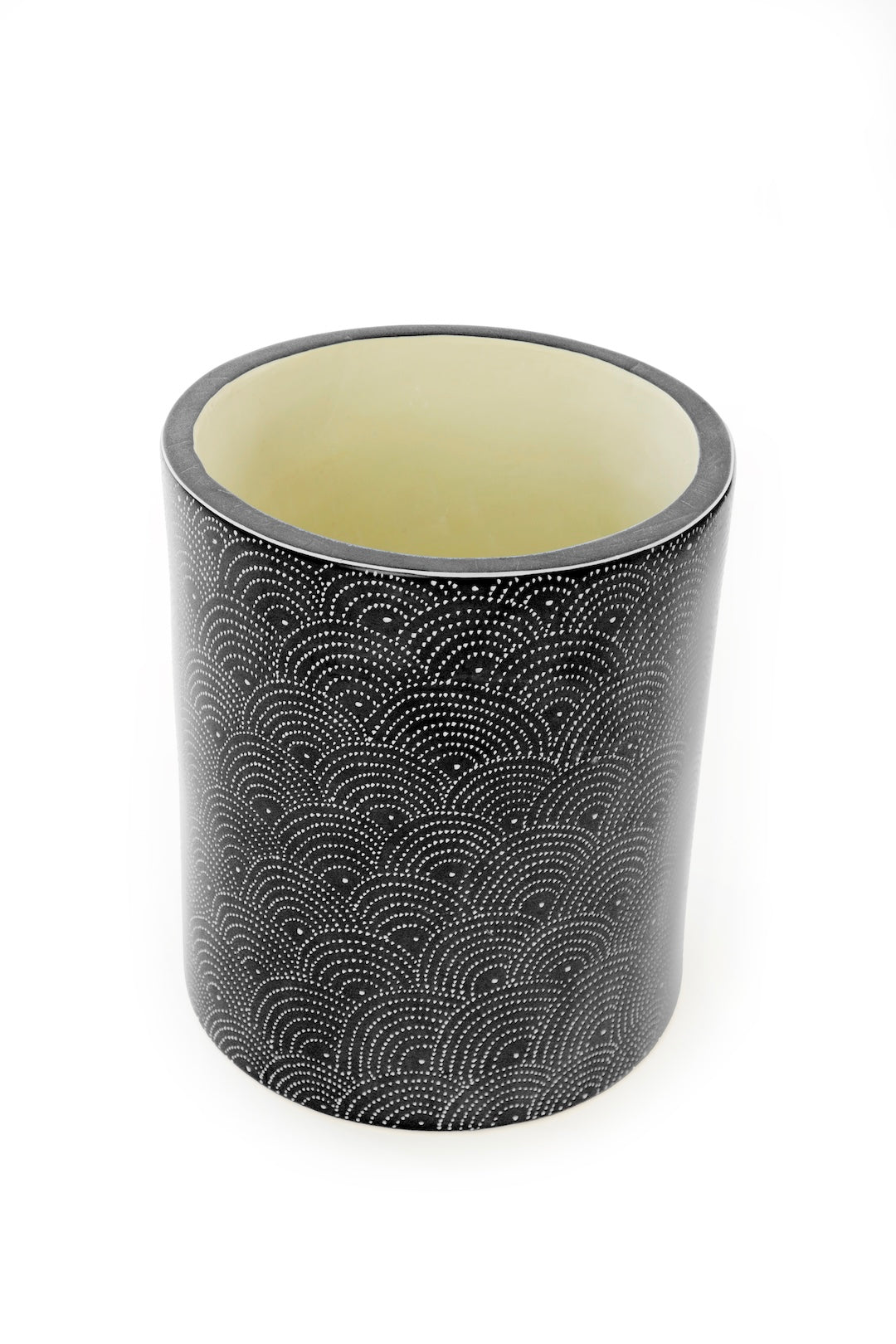 Carvers in Kenya's western highlands craft this beautiful canister from soft soapstone. Artisans in a Nairobi workshop then add a rich black dyed finish and art deco inspired etched details.