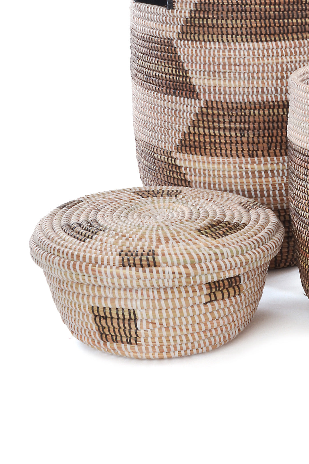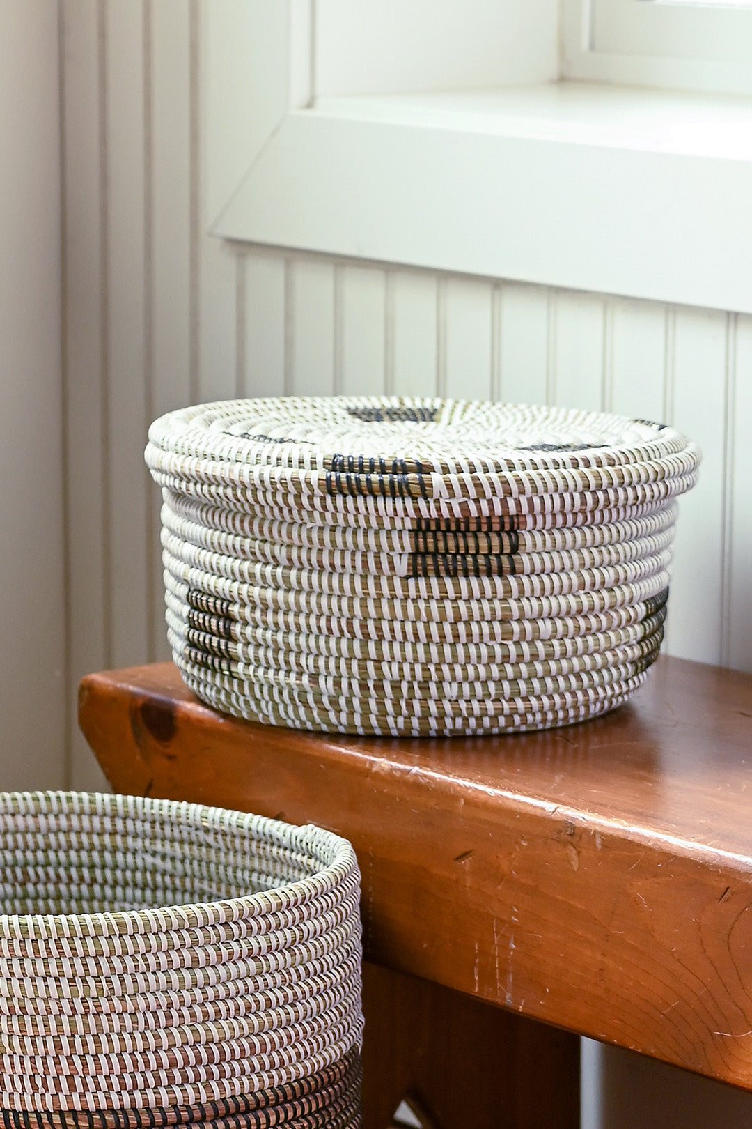 Wolof women in Senegal weave this black and white storage container by binding cattail stalks with colorful strips of plastic, purchased as salvaged end cuts at a mat factory in Dakar.