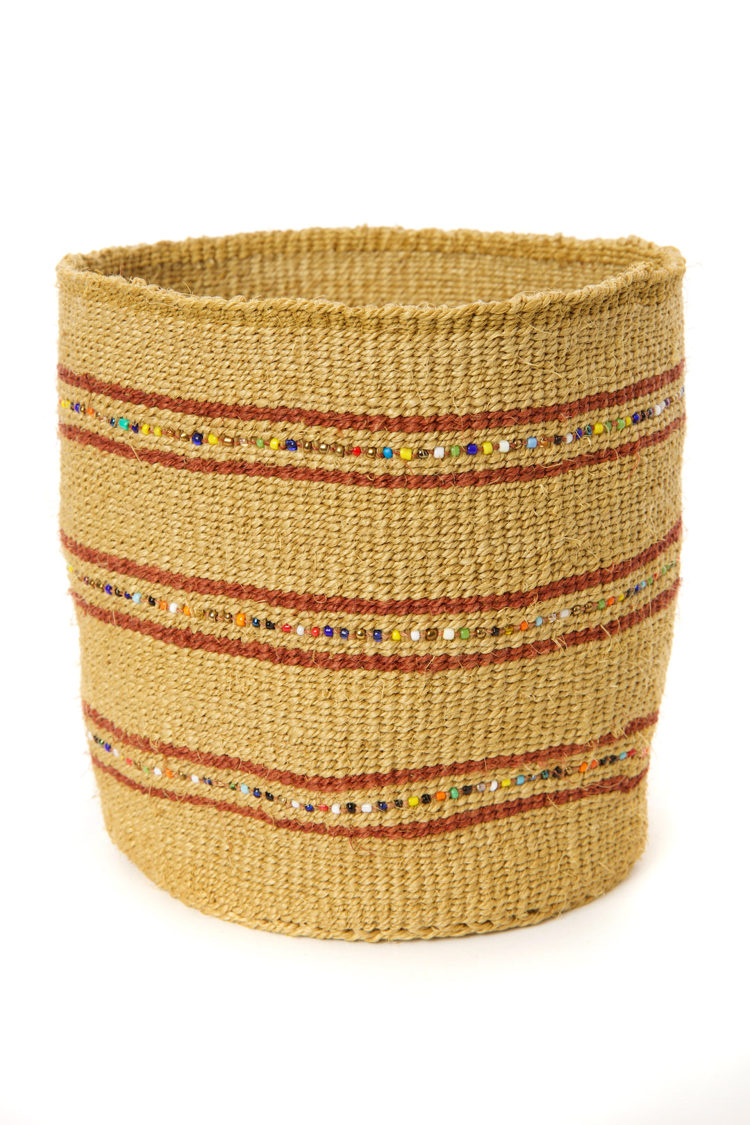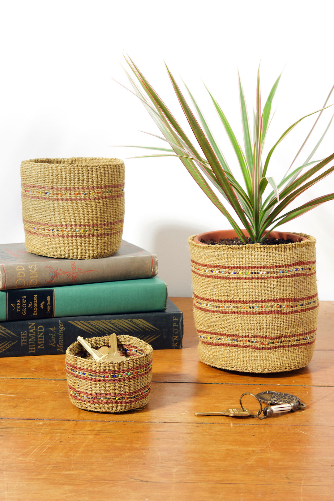 These finely woven storage baskets are handcrafted in Kenya from the fiber of the agave sisalana plant, dyed to a pleasant caramel tone. More refined than our larger sisal baskets, these three little nesting containers are dressed up with colorful beads and can be used to store small items throughout the home.