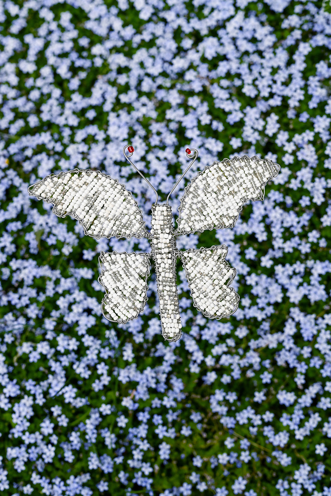 This sweet butterfly garden stake is crafted from glass beads and recycled metal, and can be gently pressed down into a flower bed, or a large planter.