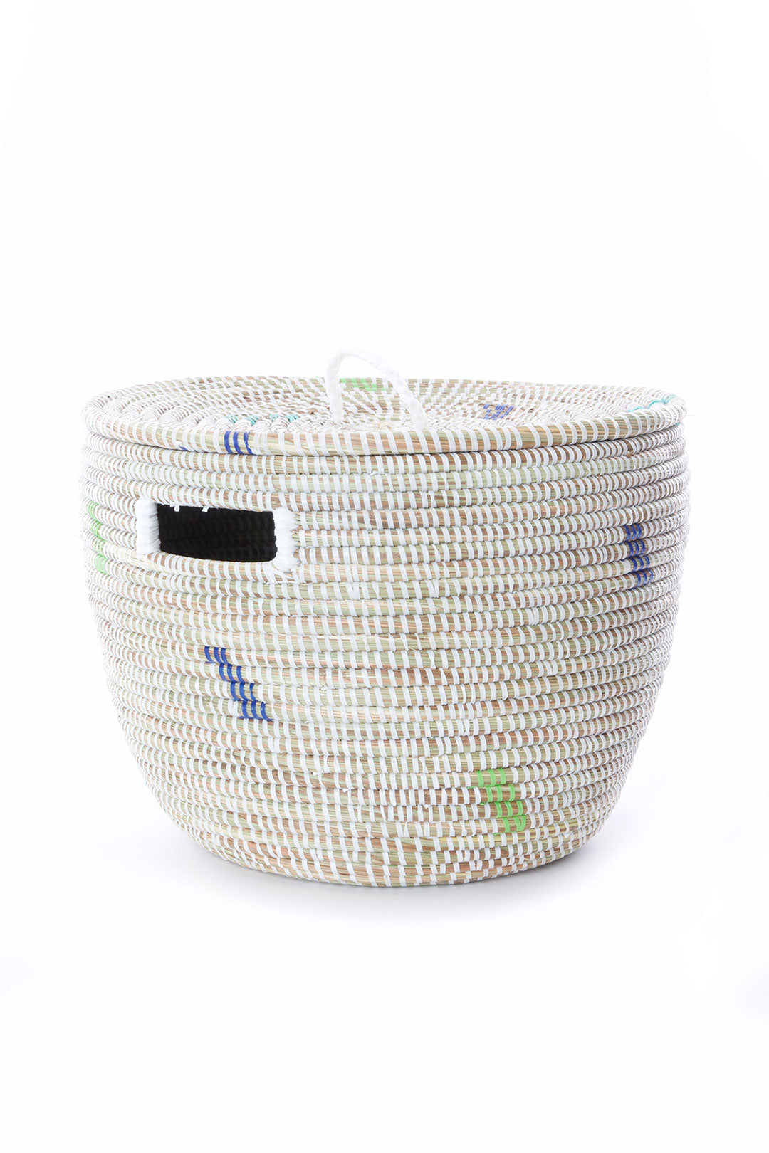 Wolof women in Senegal craft these beautiful nesting storage baskets from cattail stalks and strips of salvaged plastic. Each basket has a flat lid with a braided handle, and cutout handles on each side.