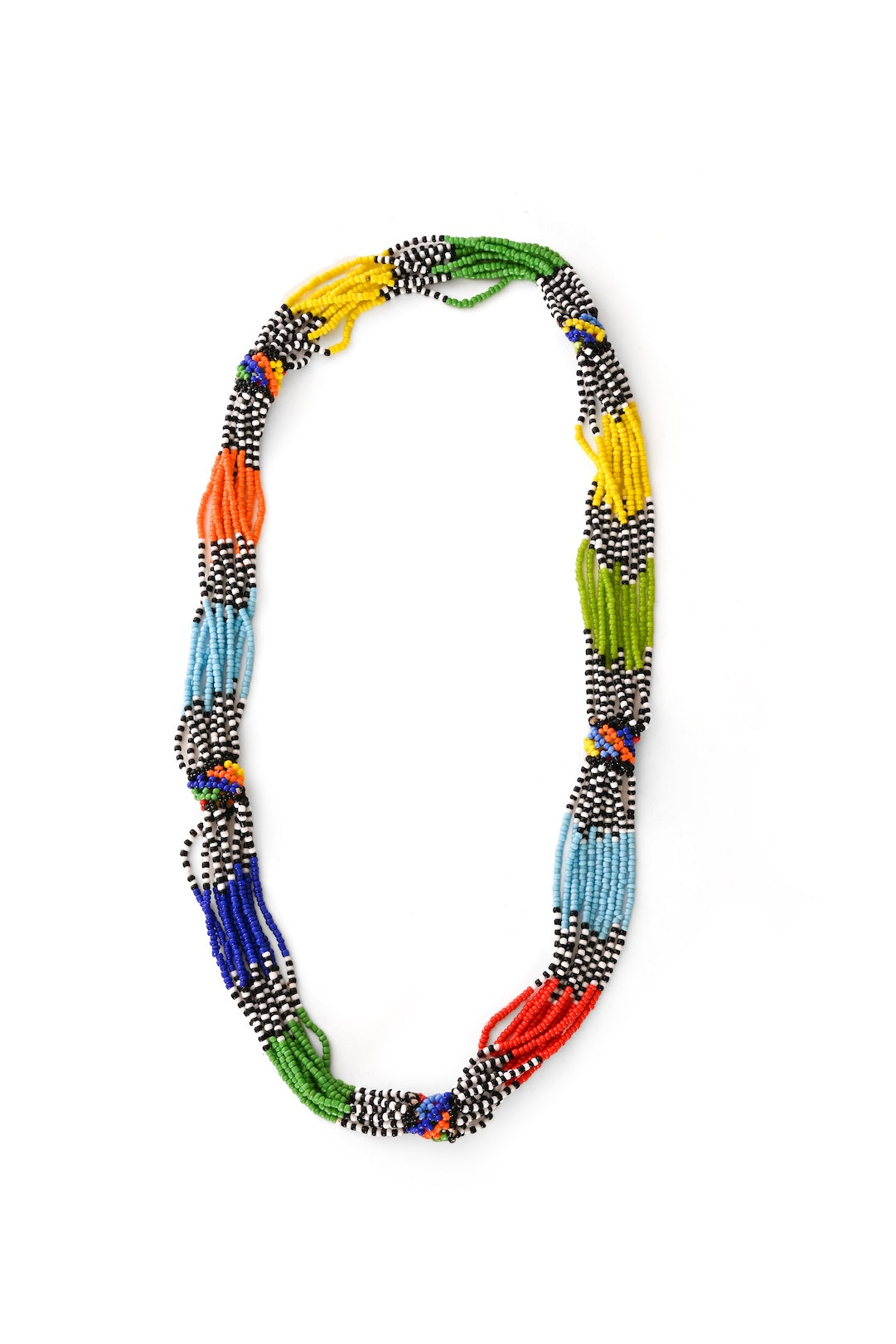 Handcrafted by Kenyan artisans, this vibrant multi-stand necklace features colorful glass seed beads, artfully strung in segments and accented with bold black and white. Designed as a continuous strand, it easily slips over the head for effortless, eye-catching style.