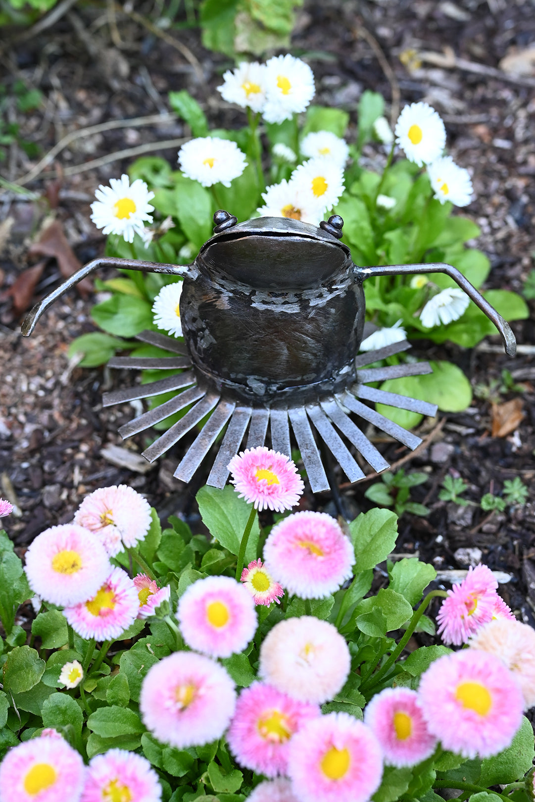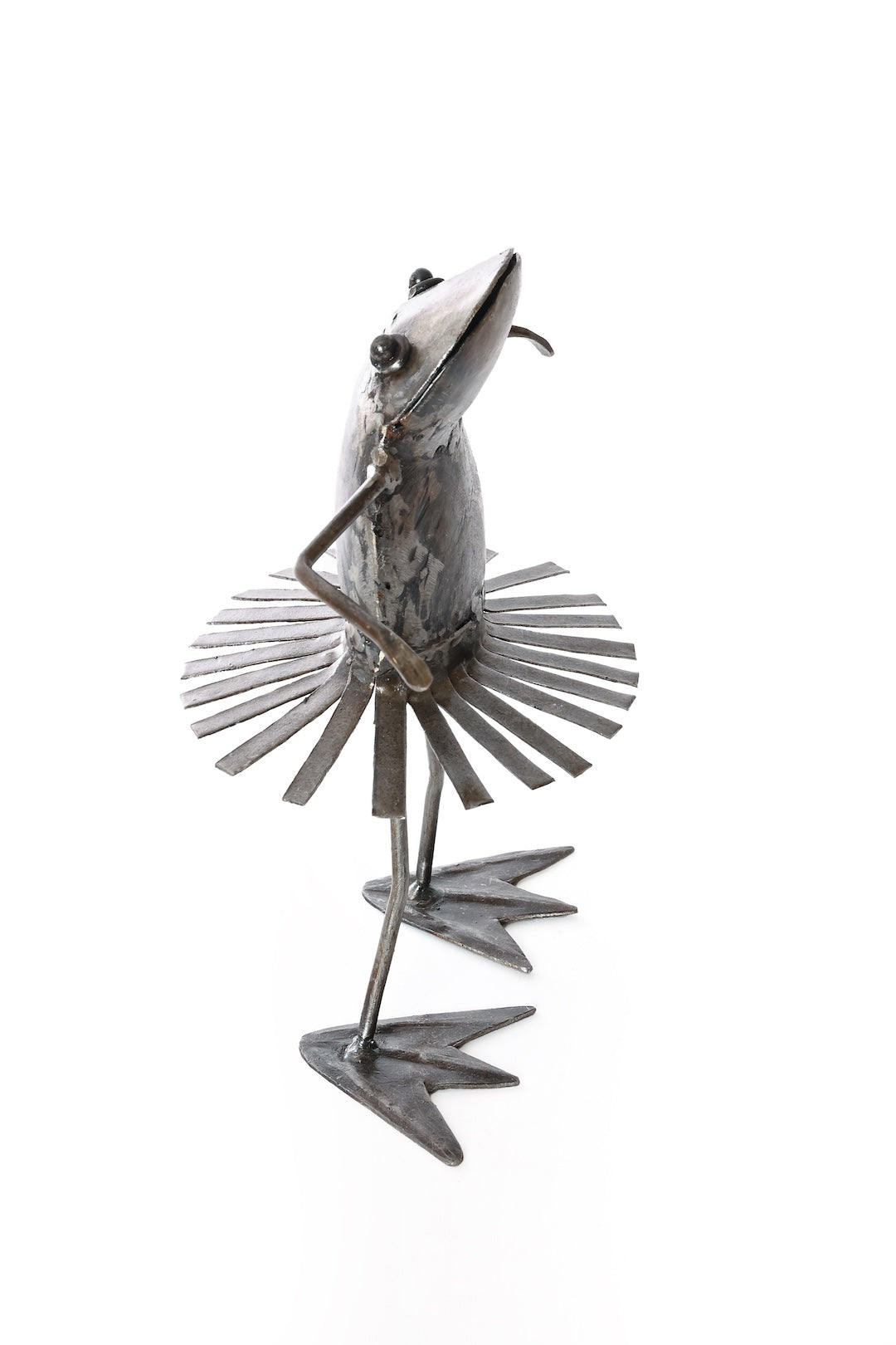 Kenyan metal artist, Francis uses recycled scrap metal to bring to life these whimsical frog sculptures. This frolicking amphibian will bring joy to your space with her swinging dance moves.