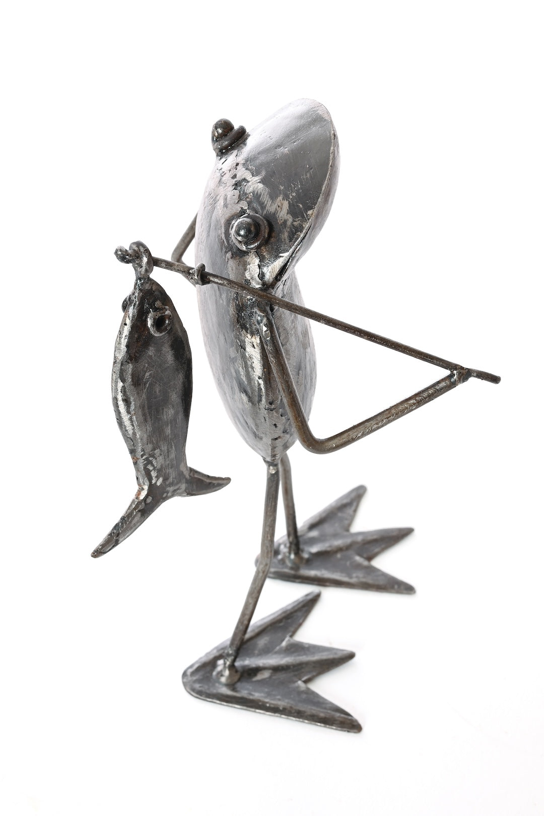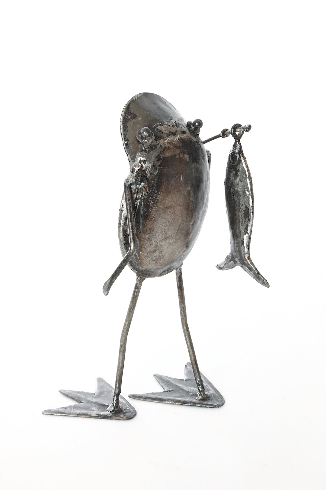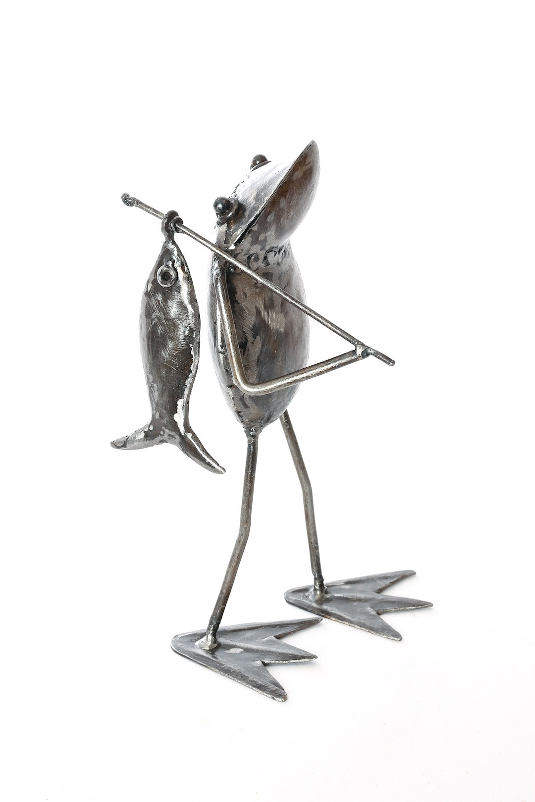 Kenyan metal artist, Francis uses recycled scrap metal to bring to life these frog fisherman sculptures. With the catch of the day proudly displayed over its shoulder, this sculpture makes a great gift for any frog lover or fishing enthusiast.
