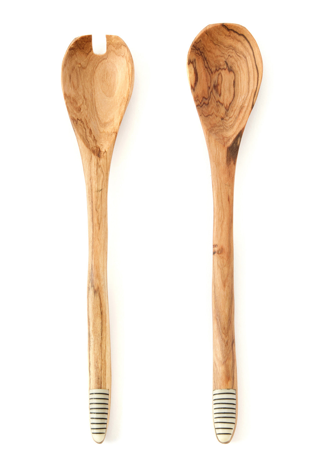 Kenyan artisans excel at carving wild olive wood into natural salad servers that grow more beautiful with age. Unique details like a notched fork tip and lightly etched and dyed bone handles combine to create a simple yet beautiful addition to the tabletop.