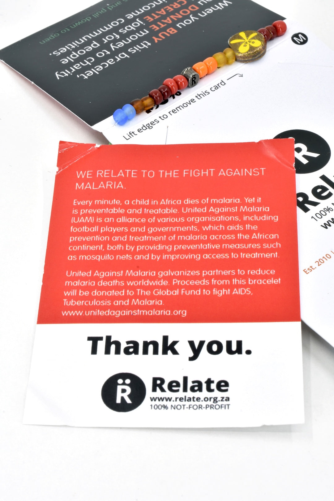 Through the sale of Protect a Child from Malaria bracelets, Relate has raised more than $74,000USD to support Goodbye Malaria. Each bracelet is handcrafted in South Africa, and includes an informative display card to promote awareness about the fight against malaria.