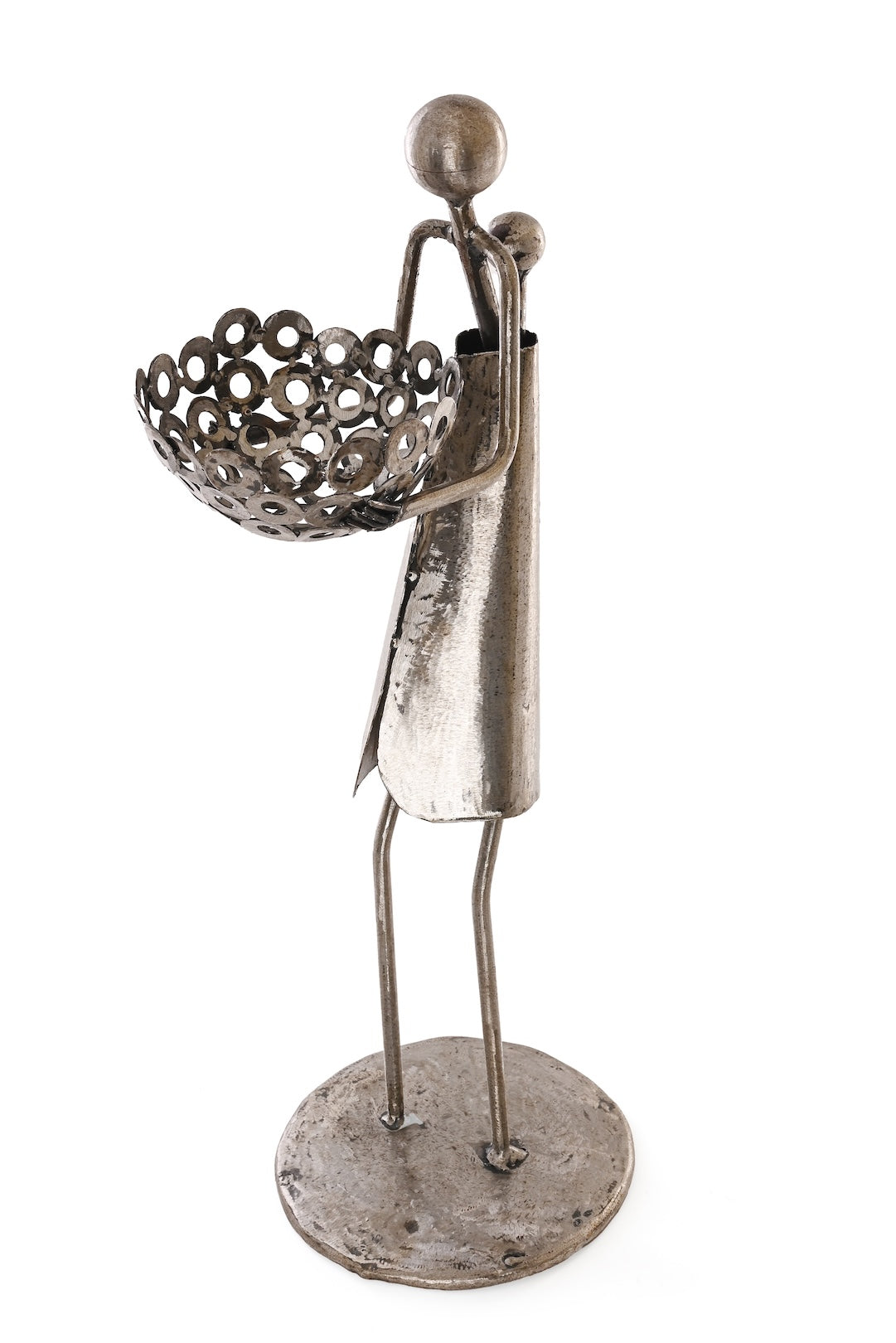 Handcrafted in Kenya by skilled metal artisans, this sculpture depicts a mother carrying her child on her back while holding a bowl formed from welded washers. Made entirely from recycled metal, it’s a heartfelt piece that celebrates strength, care, and creativity.