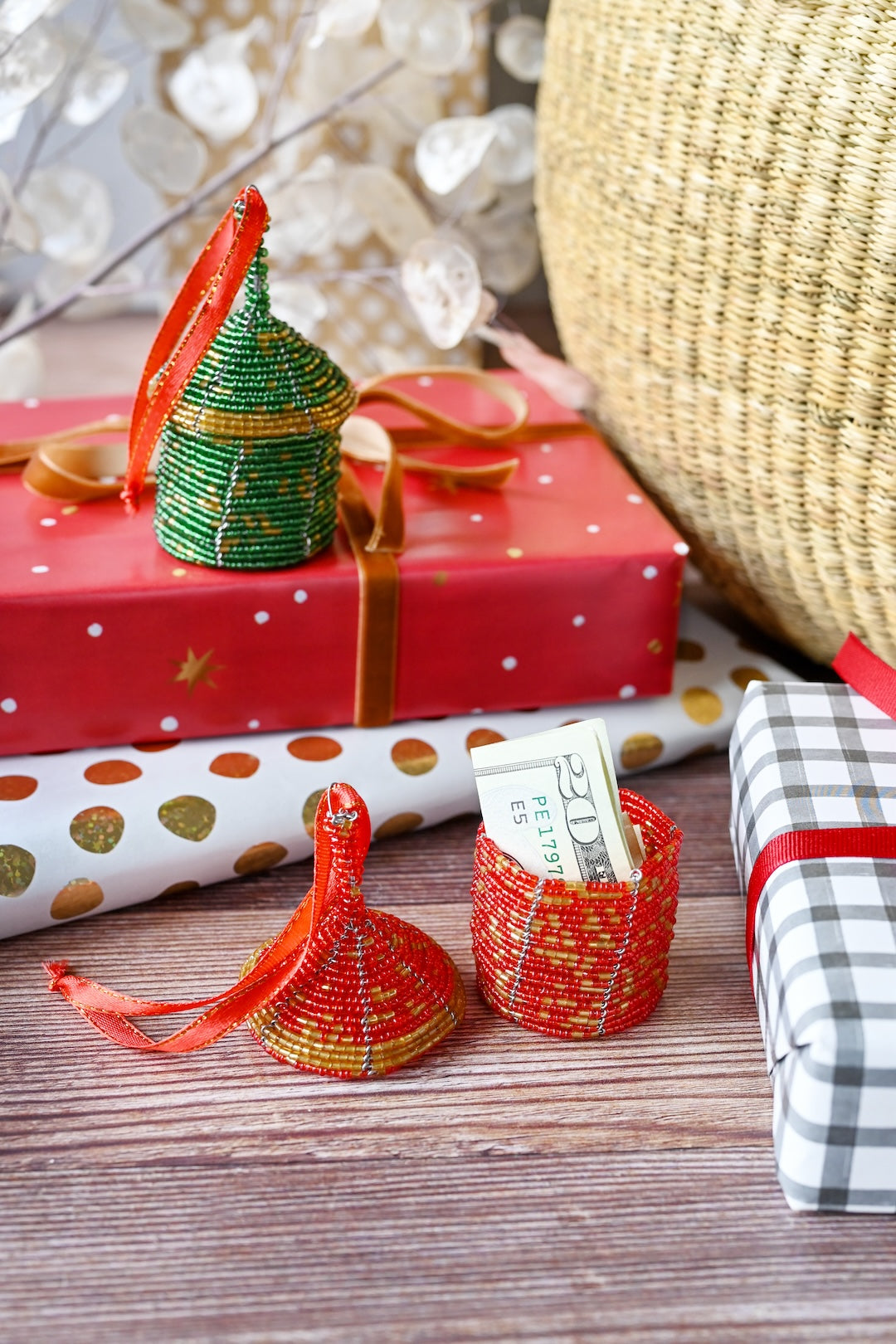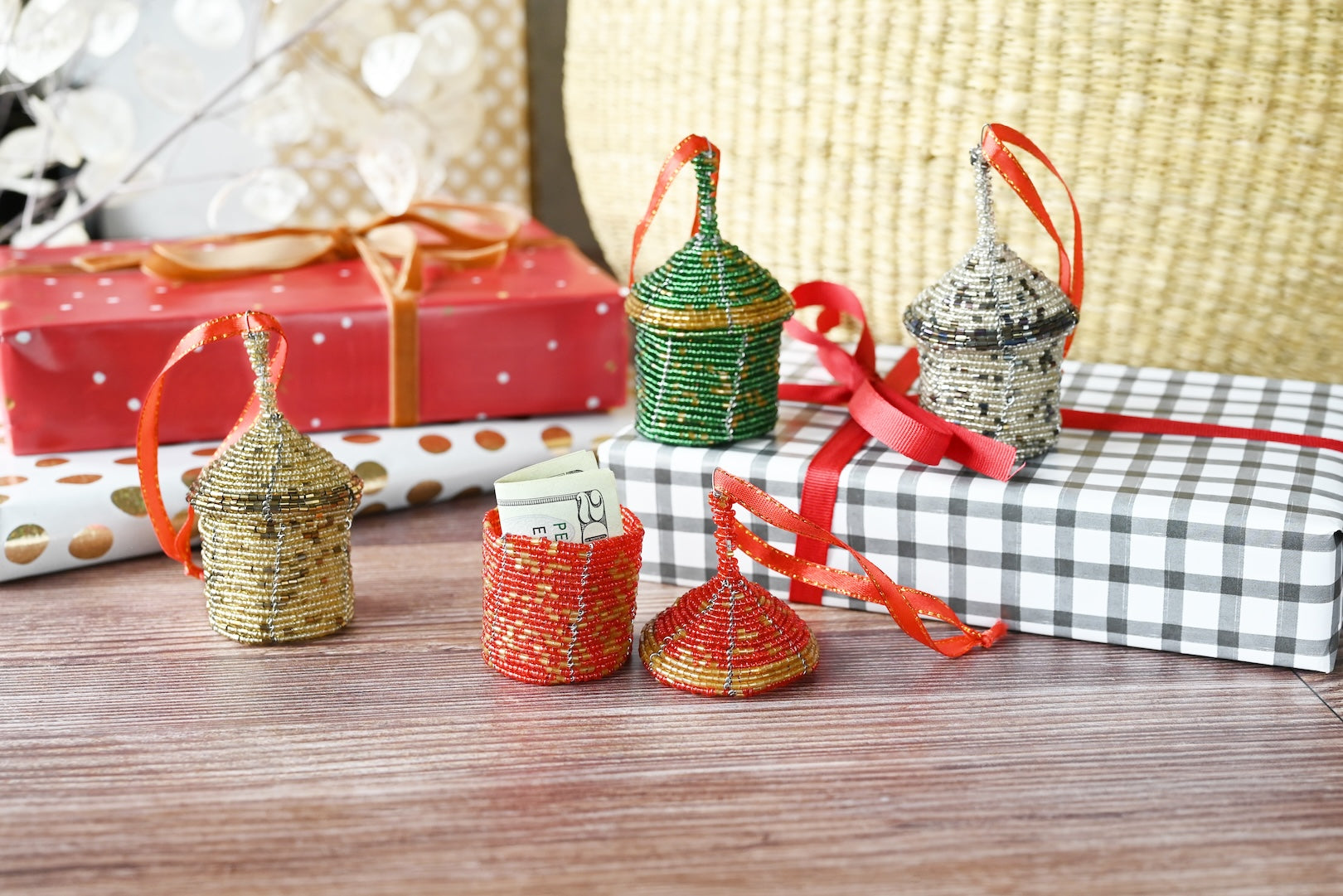 Kenyan artisans present a sweet holiday ornament that can double as a tiny gift box. Crafted from wire and beads, its removable lid offers a spot to hide sweets or small gifts.
