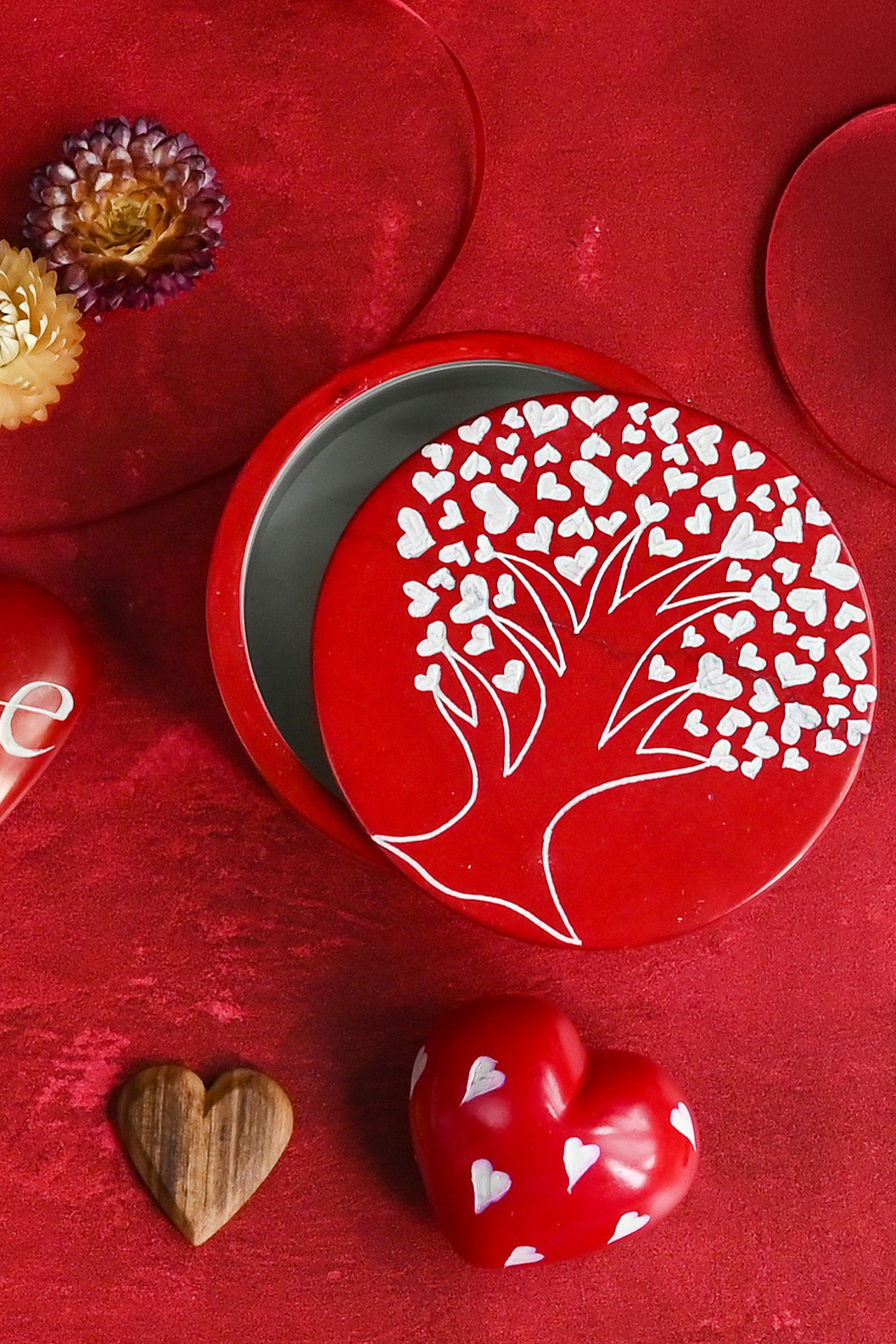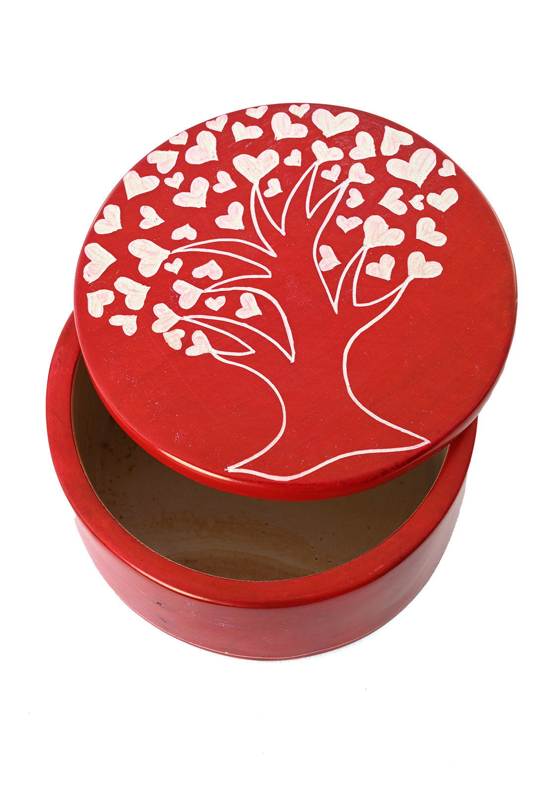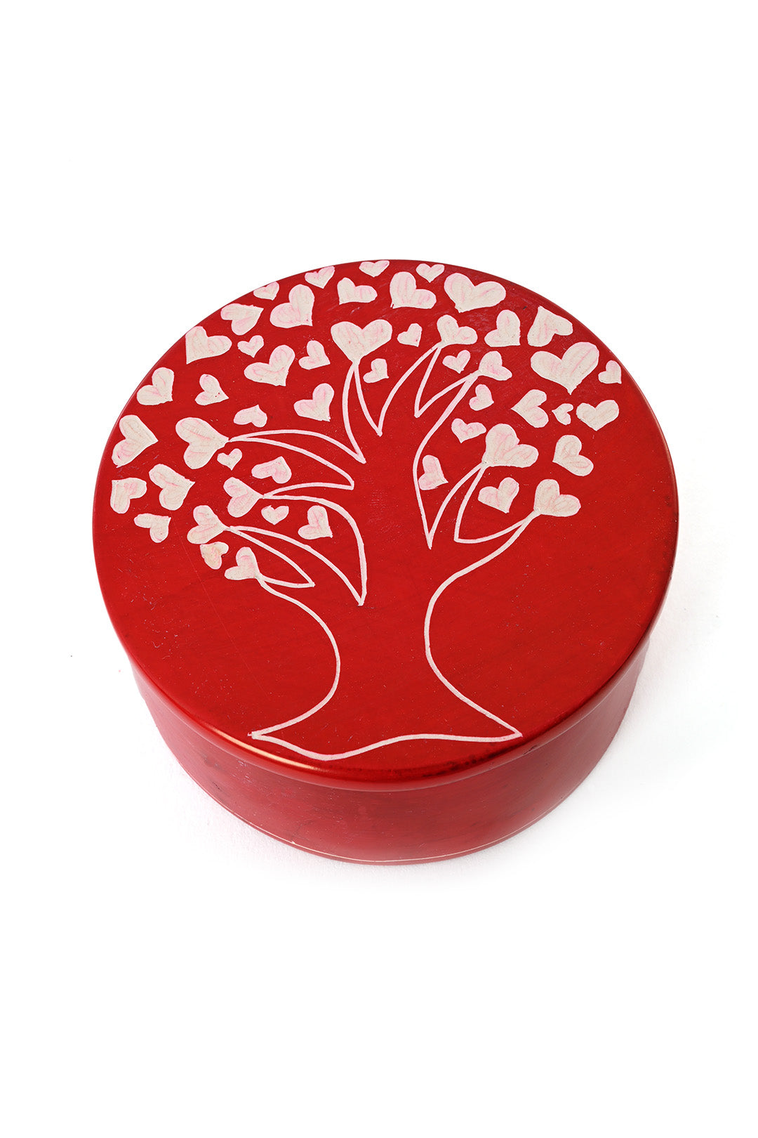 Carvers in Kenya's western highlands craft the basic form for a lidded storage box from soft soapstone. Artisans in a Nairobi workshop then add a deep red dyed finish and etched details of tree of hearts in full bloom.