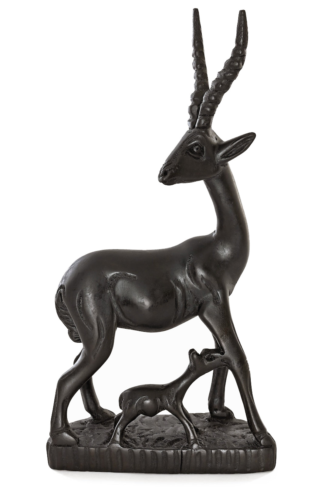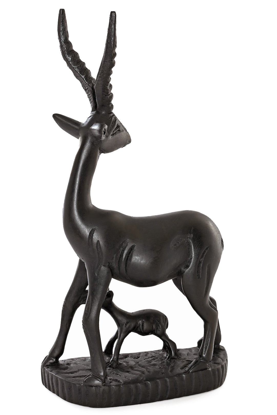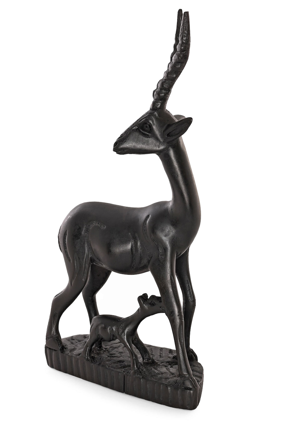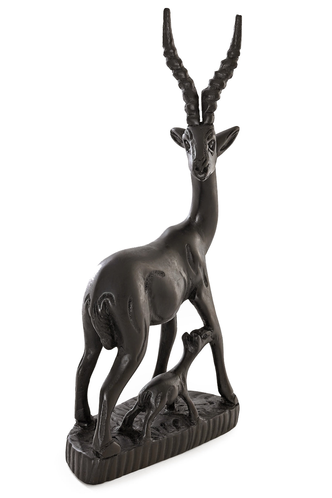 This sweet sculpture depicting a mother antelope with her calf is hand-carved in Kenya from sustainably sourced jacaranda wood that has been dyed a rich black hue
