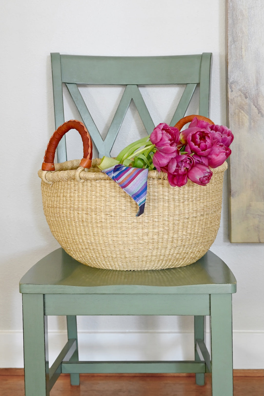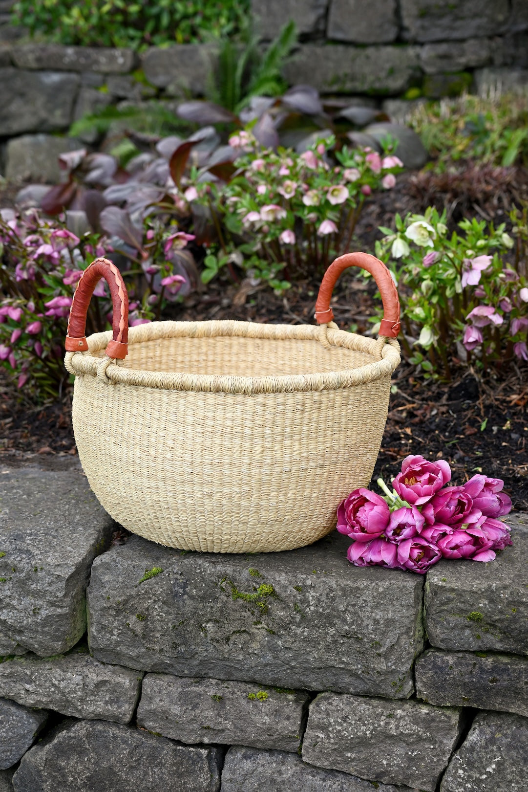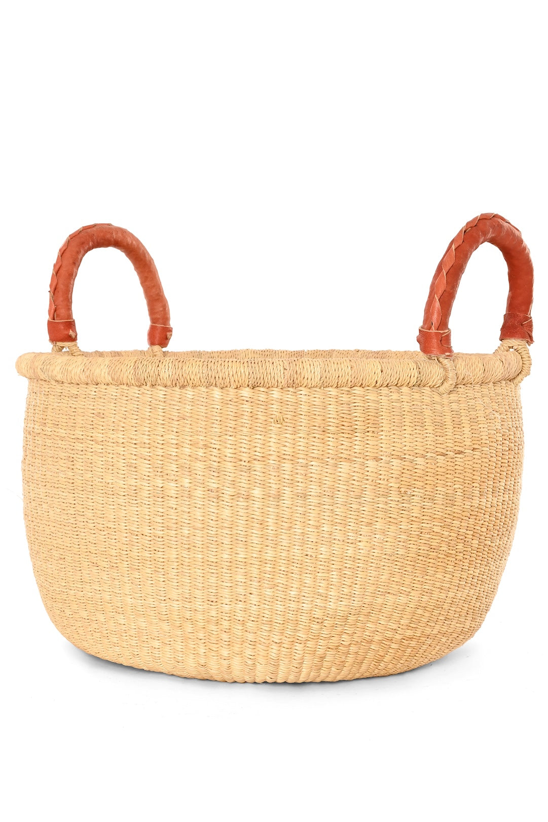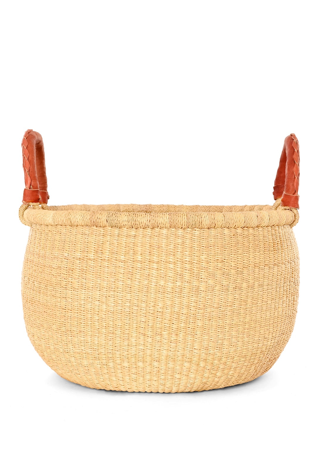 Handwoven by skilled artisans in Bolgatanga, Ghana, this Bolga basket is a new take on a classic design. Skillfully crafted from stiff stalks of elephant grass, Bolga baskets are  known for their durability and iconic style, loved and used in homes everywhere. This all natural basket features two leather-wrapped handles for added comfort and durability.