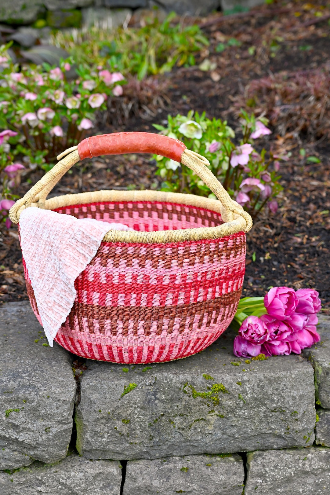 Handwoven by skilled artisans in Bolgatanga, Ghana, this Bolga basket is a beautiful, functional work of art crafted from stiff stalks of elephant grass. Known for their durability and iconic style, Bolga baskets are beloved in homes everywhere. This version features a pattern in warm shades of brown, maroon, and pink with a soft brown leather-wrapped handle for added comfort and lasting use.
