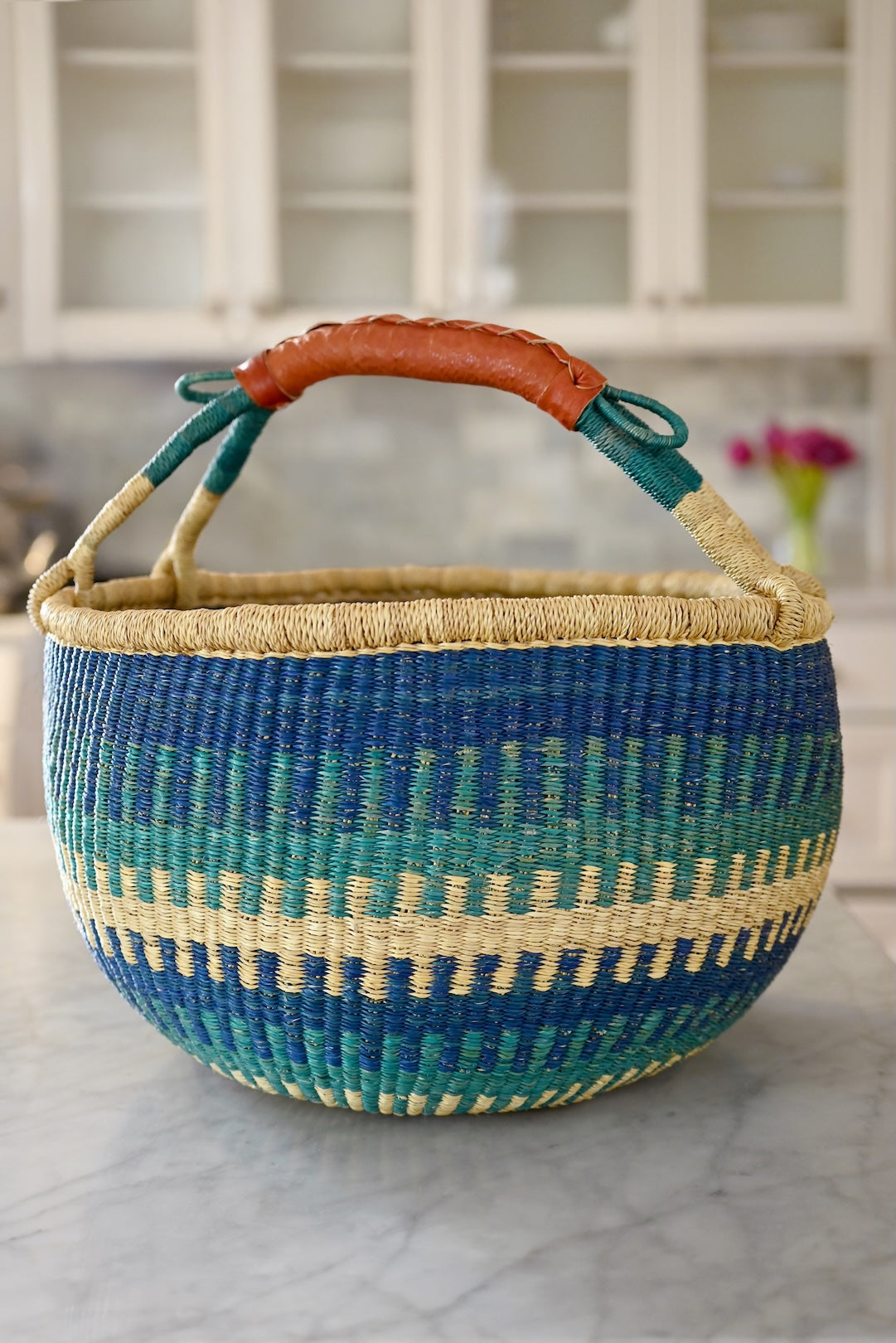 Handwoven by skilled artisans in Bolgatanga, Ghana, this Bolga basket is a beautiful, functional work of art crafted from stiff stalks of elephant grass. Known for their durability and iconic style, Bolga baskets are beloved in homes everywhere. This version features a pattern in natural and shades of light blue and royal blue with a soft brown leather-wrapped handle for added comfort and lasting use.