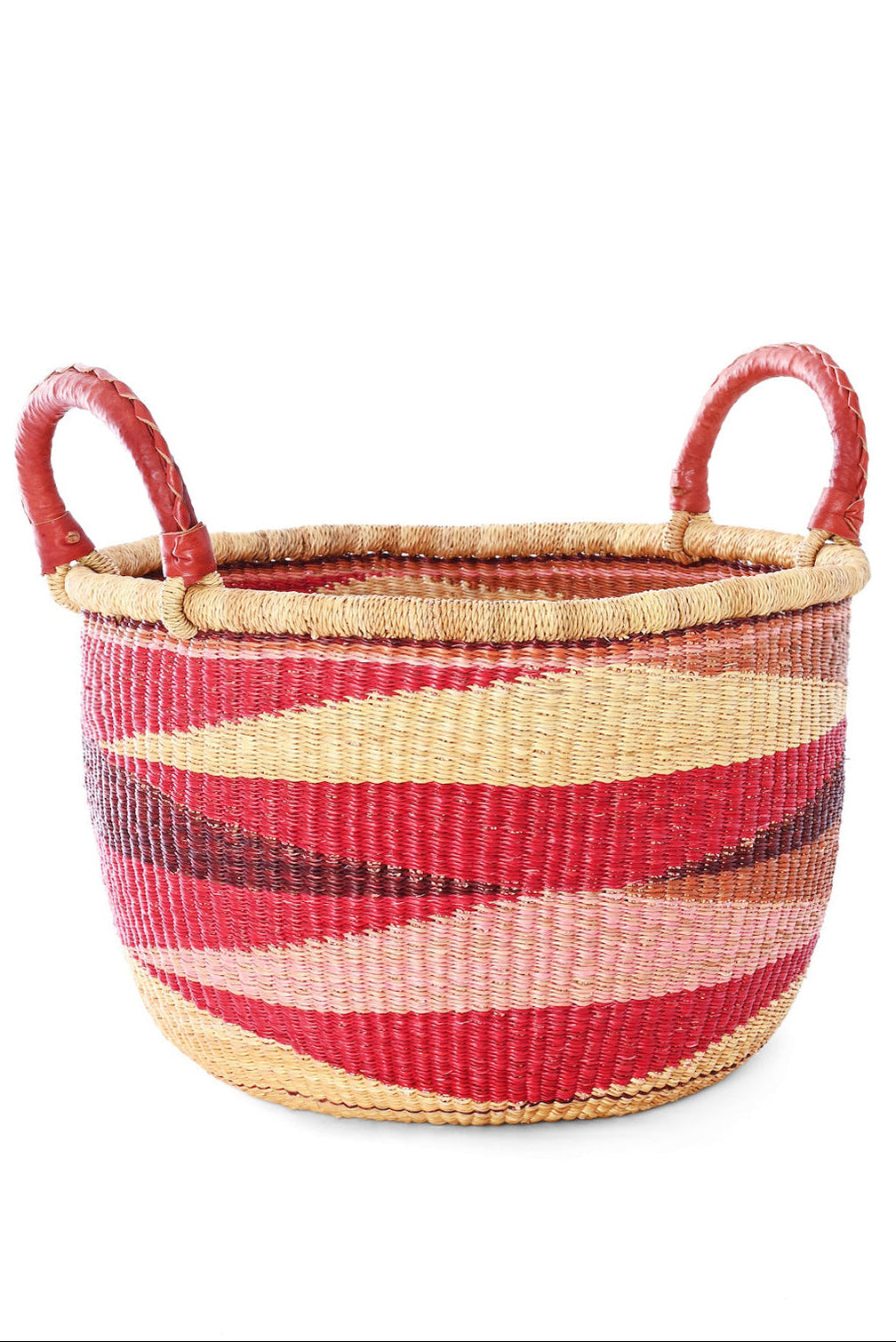 Handwoven by skilled artisans in Bolgatanga, Ghana, this Bolga basket is a new take on a classic design. Skillfully crafted from stiff stalks of elephant grass, Bolga baskets are  known for their durability and iconic style, loved and used in homes everywhere. This version features a triangle pattern in natural, and shades of sweet potato, pastel pink, maroon, and dark brown with two leather-wrapped handles for added comfort and durability.