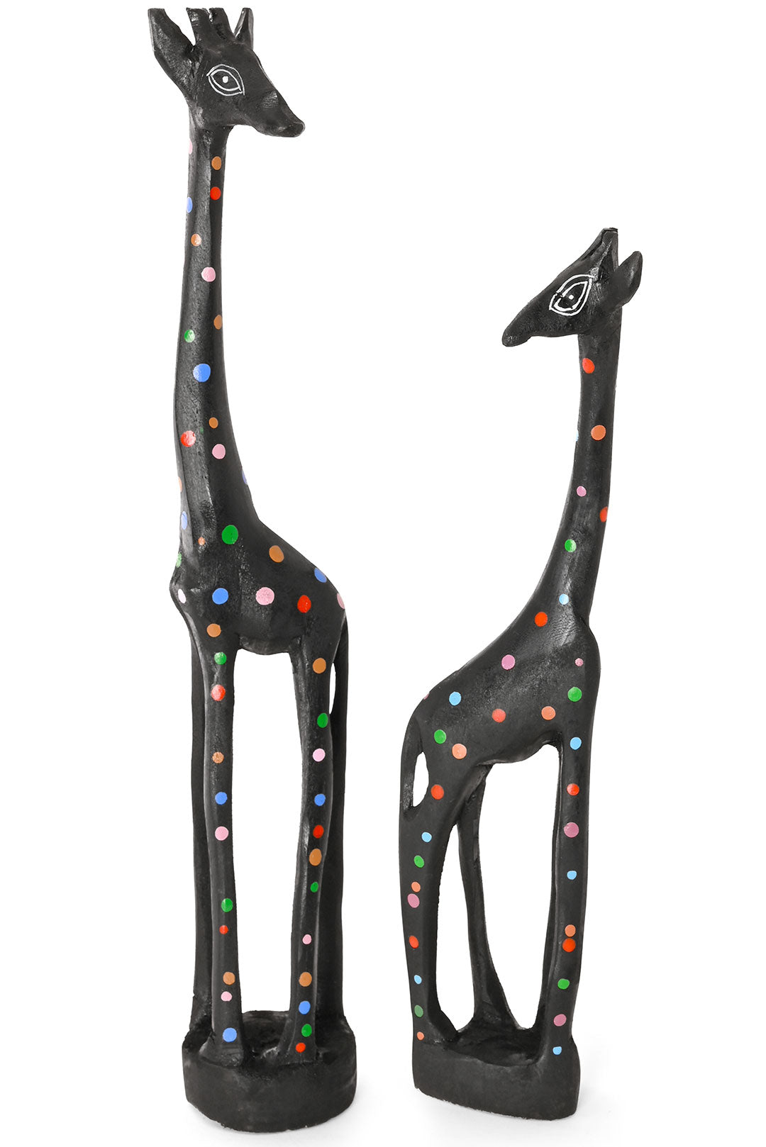 This striking giraffe sculpture showcases the talent of Kenyan wood carvers and painters. Using sustainably-sourced jacaranda wood painted with acrylic, carvers create classic safari-themed folk art with a modern twist.