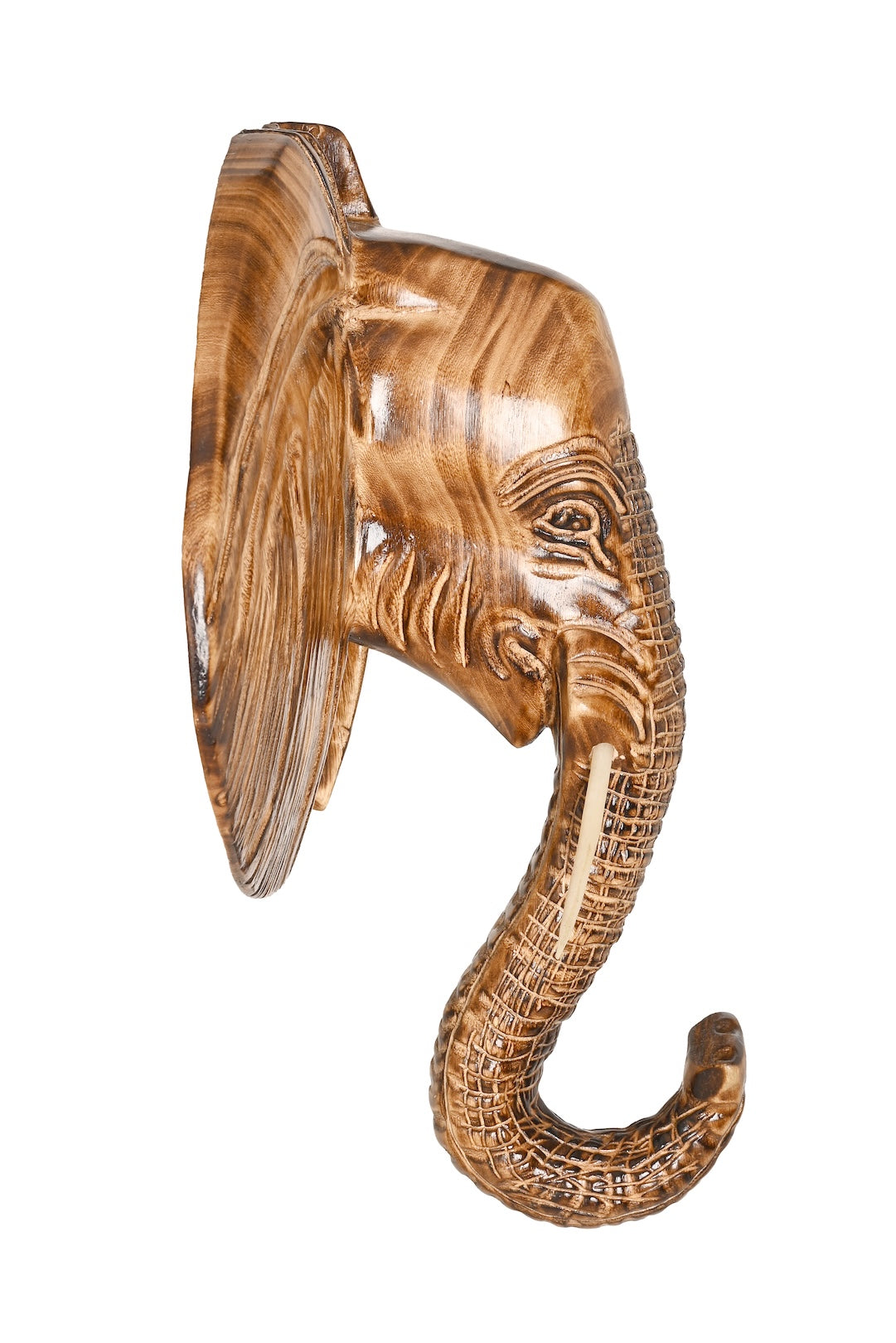 This rustic elephant wall mask is hand carved from jacaranda wood and cow bone by carvers in Nairobi, Kenya. A sturdy hanging loop is carved into the top of the mask, making it easy to secure in place. Jacaranda is naturally pale, so carvers use a torch to add contrast and color to the mask finishing with a glossy clear coat.