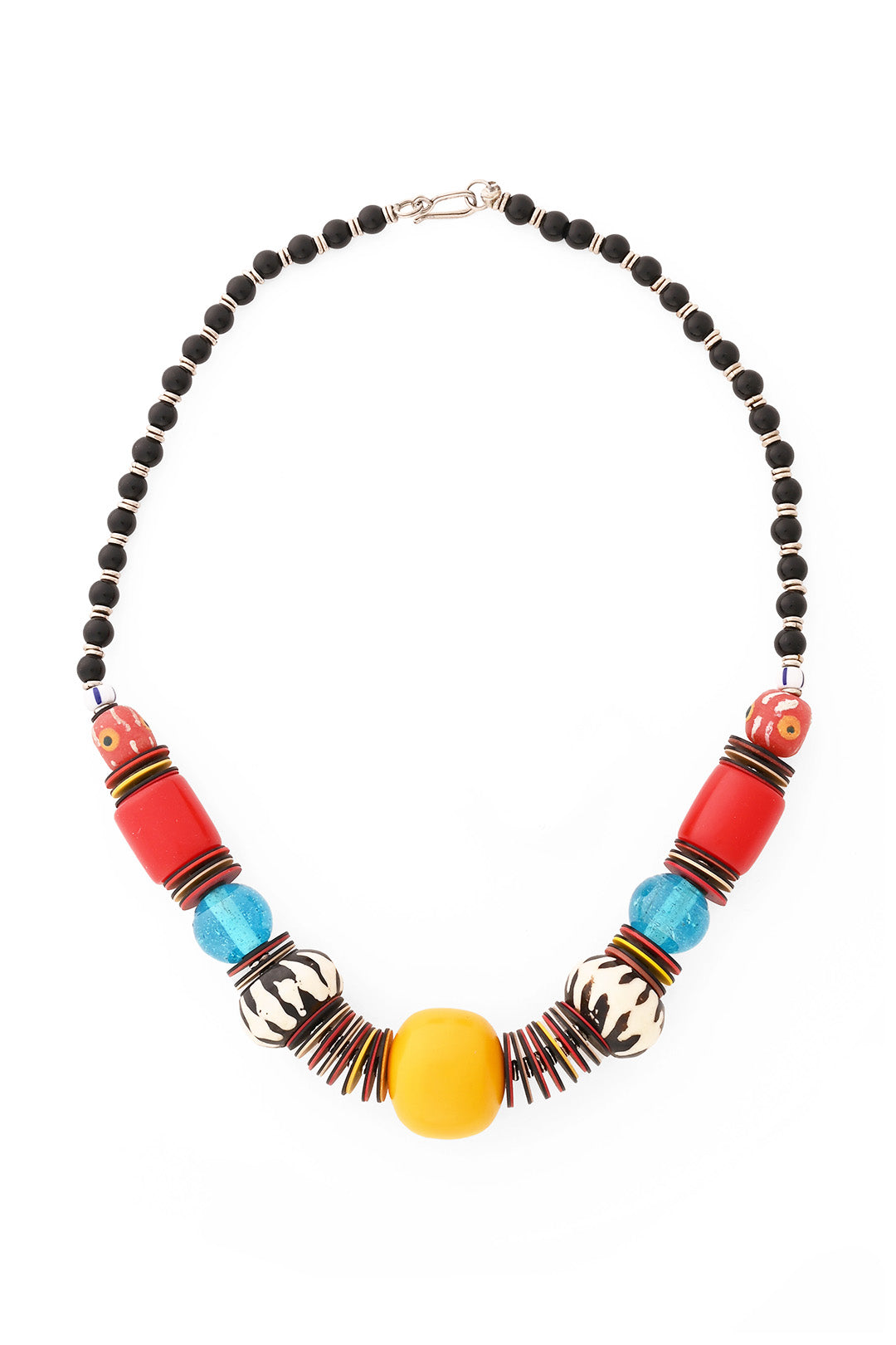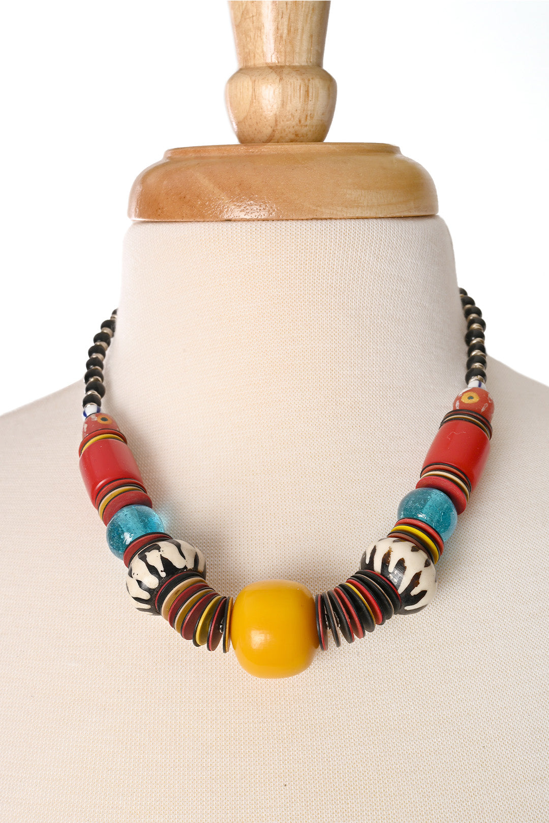 Handcrafted by Kenyan artisans, this vibrant necklace features a sunny yellow focal bead hugged by vintage ‘phono’ disk beads made from recycled vinyl records. Accented with beads of glass, batiked bone, and resin, it’s a striking mix of vintage character and modern style.