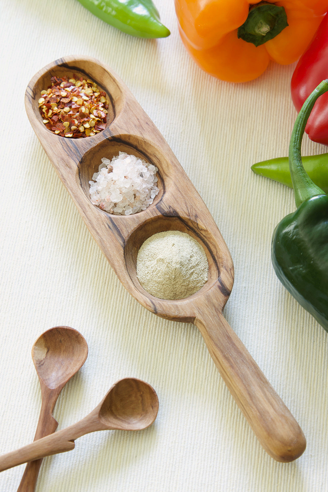 Kenyan artisans hand carve unique serving trays from beautifully grained wild olive wood. Available in two sizes, each tray features three wells for condiments, spices, sweets and more, as well as a substantial handle.